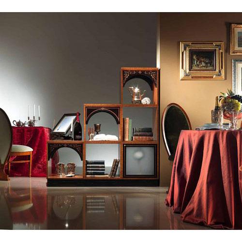 It consists of single elements, freely combinable with each other. Four different types of elements: open, with frosted glass door, with an ebony arch inlaid in different essences and with an ebony arch inlaid in rosewood. All the frontal thicknesses are in zebrano.