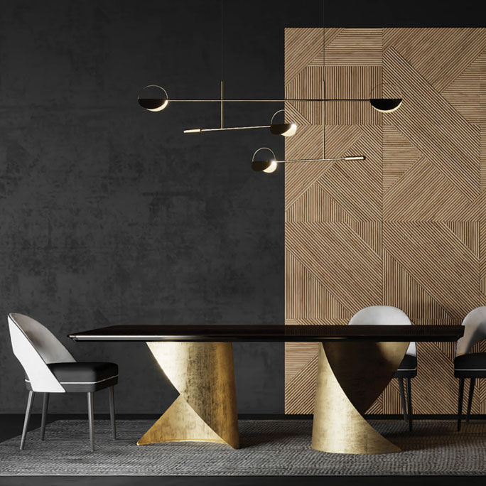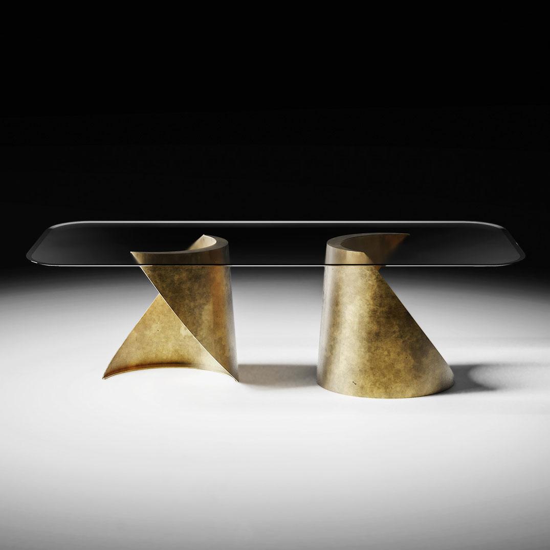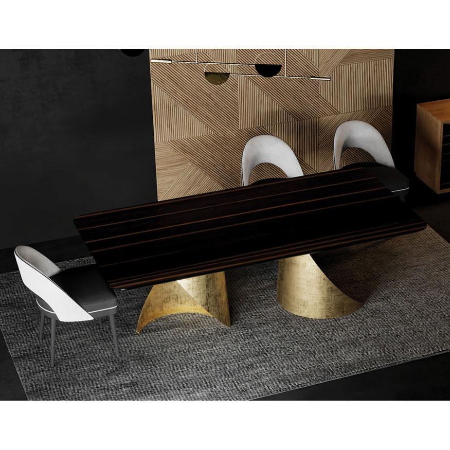 For a charming dining area solution, Encore presents an elegant rectangular table. Two curved metal plates are the pillars on which the rectangular top in precious ebony, glass or lacquered rests. The table characterized by a material contrast between the metal base and top finishes.