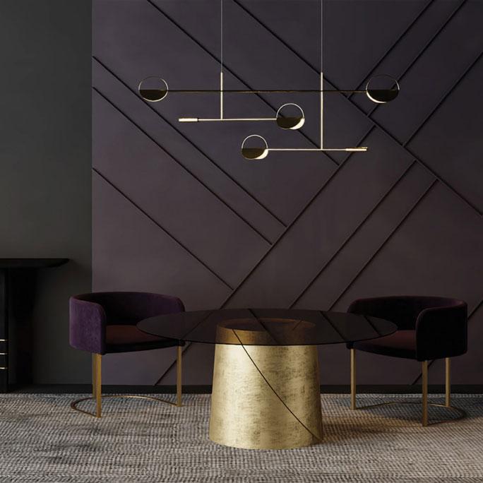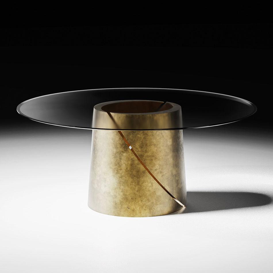 For a charming dining area solution, Encore presents an elegant round table. Two curved metal plates are the pillars on which the round top in precious ebony, glass or lacquered rests. The table characterized by a material contrast between the metal base and top finishes.