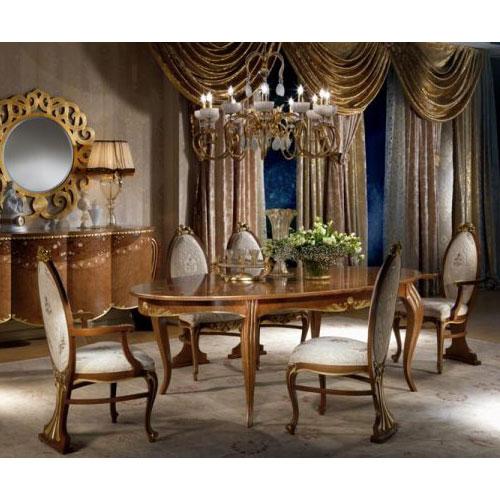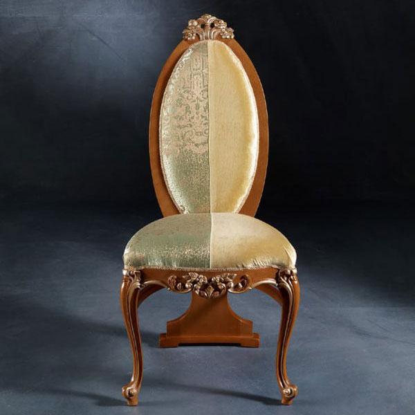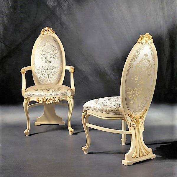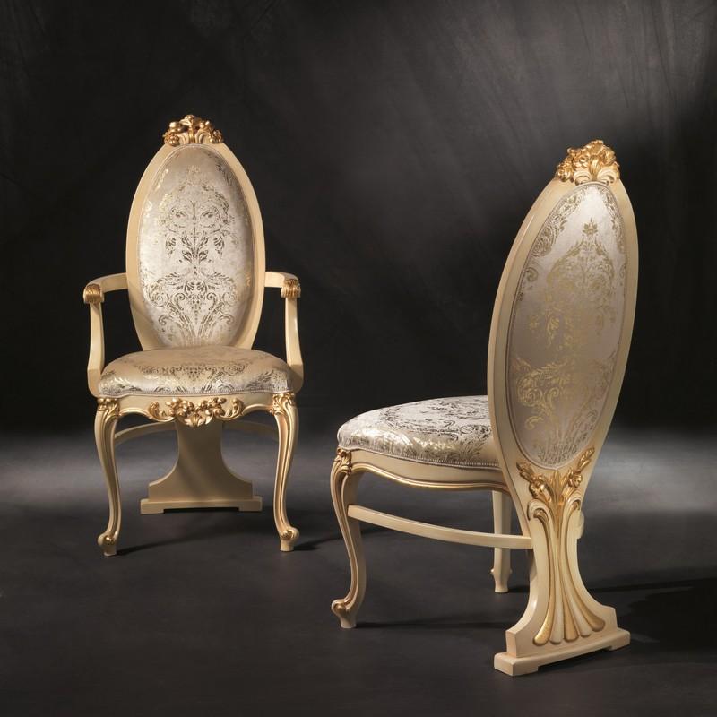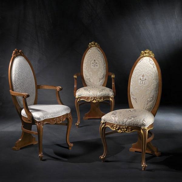 In hand-carved solid wood, decorated with sculptural motifs covered in gold leaf. On request, they can be made without gold leaf details. Seat with elastic straps and polyurethane foam padding.