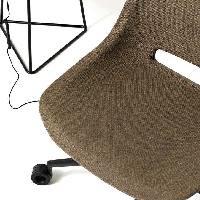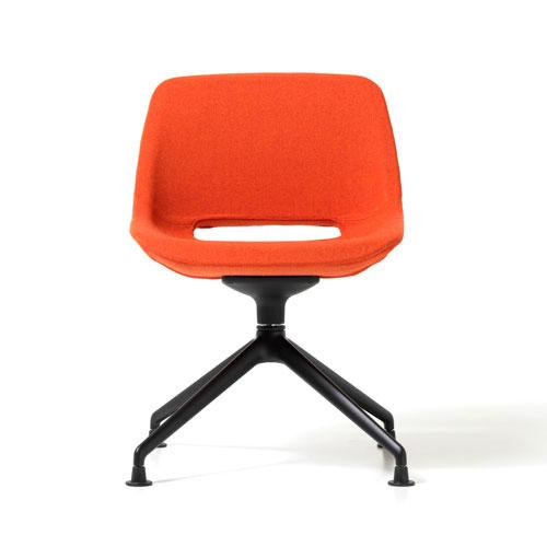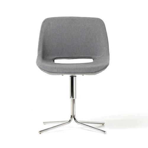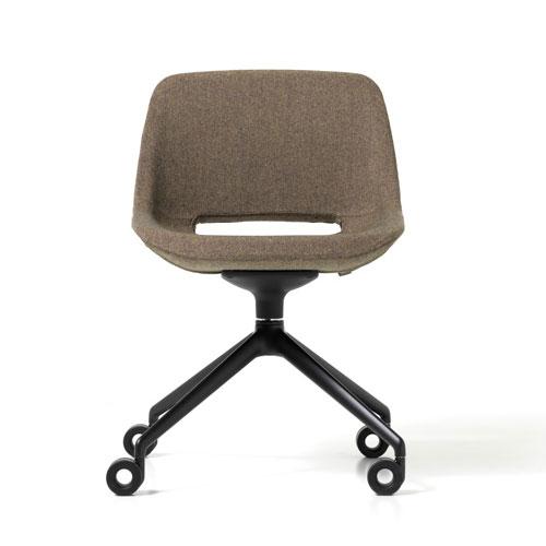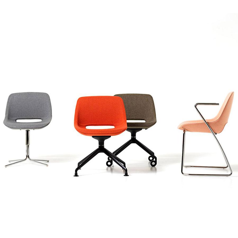 A curvy shell with inner steel structure and padding in cold polyurethane foam. Available on various bases: 5-spur aluminum with swivel, gas lift and rubber wheels; 4 aluminum blades with automatic return mechanism; 4 tubular steel spokes with swivel; chromed sled; black or white lacquered pyramid.
