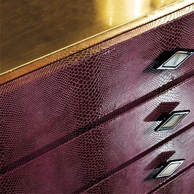 Chest of drawers covered with snake printed leather, carved and gold leaf base gold leaf top.