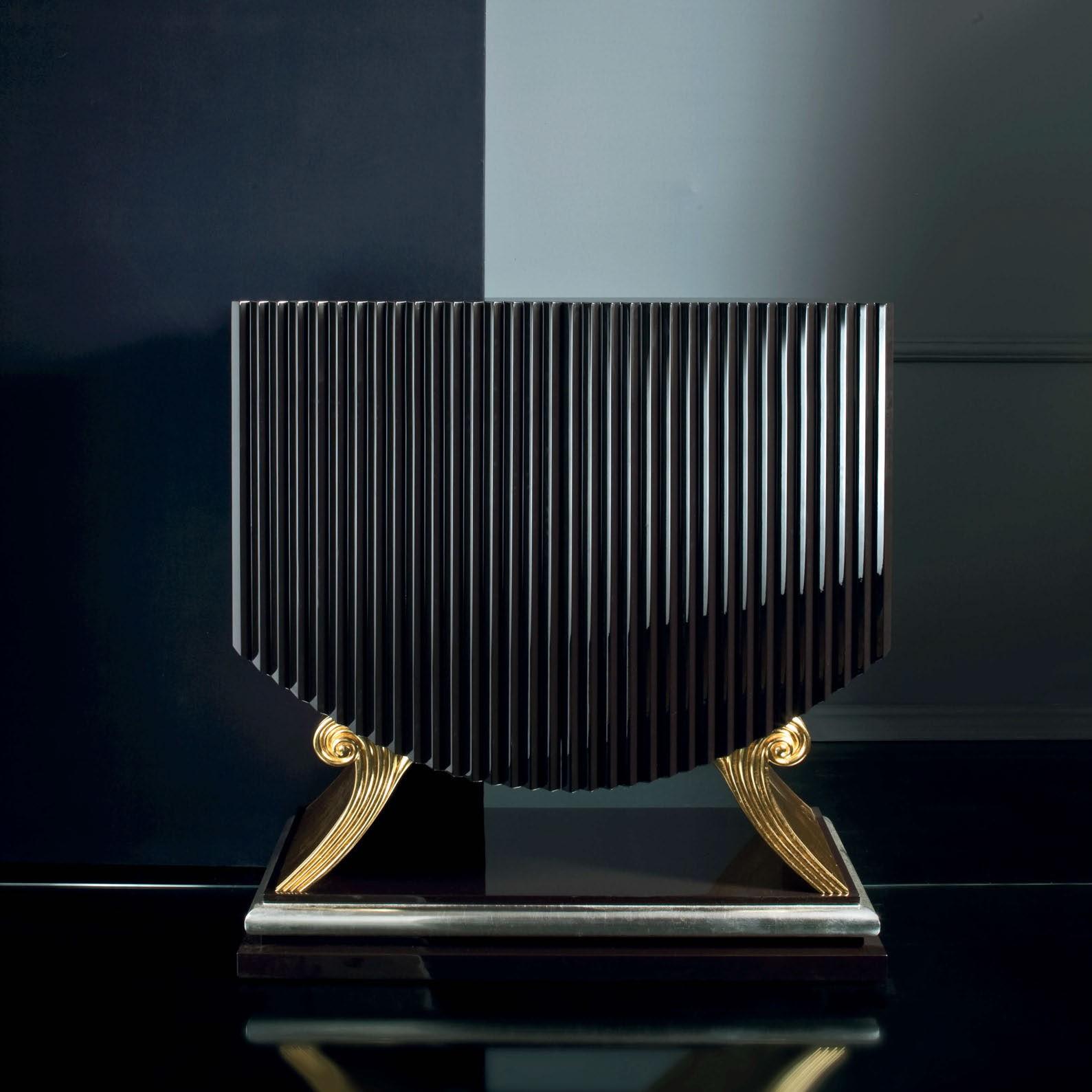 Cabinet black lacquered, carving in gold leaf and silver leaf details.
