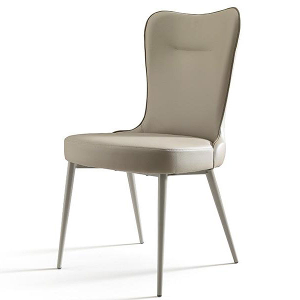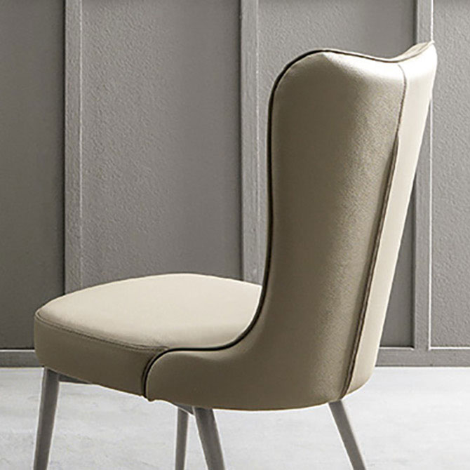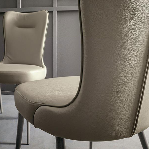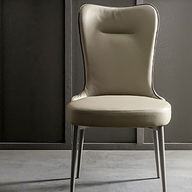 Minnie is the chair with a young spirit and a lively character. The high backrest with fluid and enveloping lines invites you to be welcomed. Her profile is made clear in the thin border in the same color or in contrast, reinforcing the style. The metal legs make it ideal for furnishing living areas or particularly advanced kitchens. Chair with covered wooden back and painted metal conical legs. Matching seams and profile. Profile in faux leather of your choice.