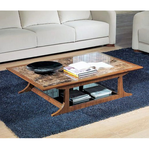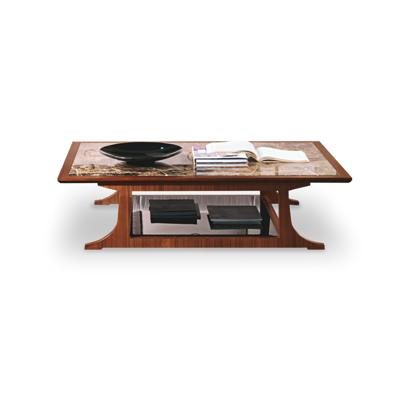 Rectangular coffee table in natural Canaletto walnut with Emperador marble top.