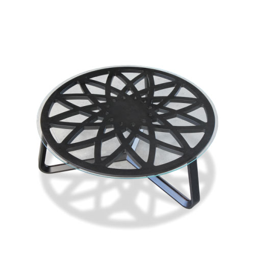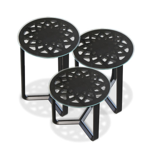 Set of small tables from the Galileo line, perforated wooden structure, slate dyed finish and transparent glass top.