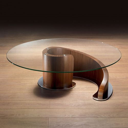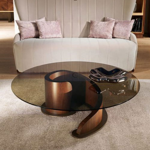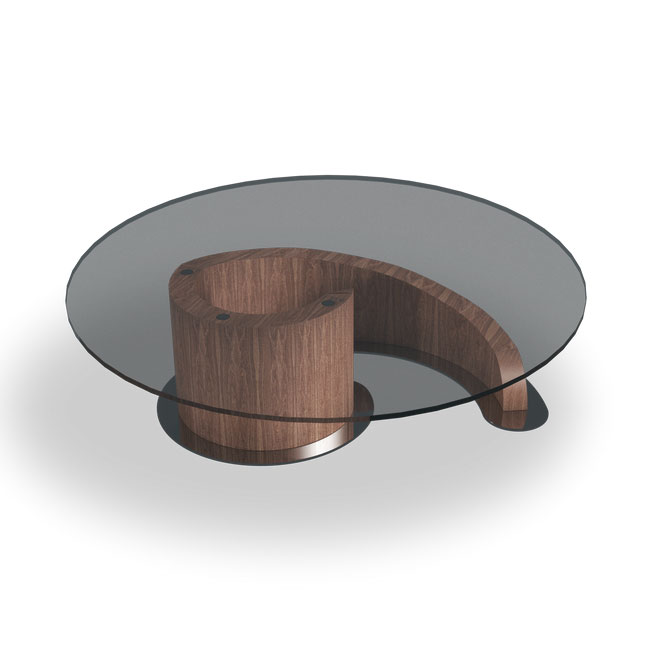 Coffee table with snail-shaped base. The structure is in Canaletto walnut available in natural finishes with transparent glass top and chromed metal base (TL41) or in chocolate finish with bronzed glass top and satin bronze metal base (TL41B).