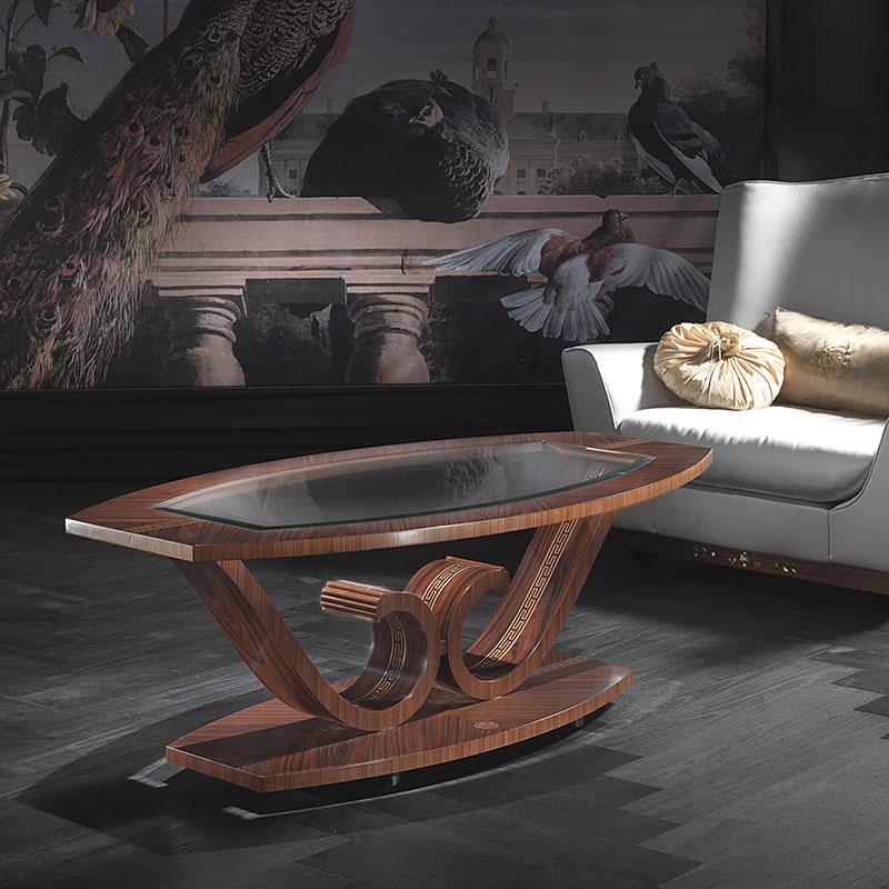 The structure is in rosewood. A rich Greek inlaid on a rosewood background accompanies the thickness of the top and the volutes in solid slabs that characterize the base. The profiles are in rosewood. The top is in cut crystal. It is easy to position because it is equipped with small wheels. Presented in the hazelnut dyed version.