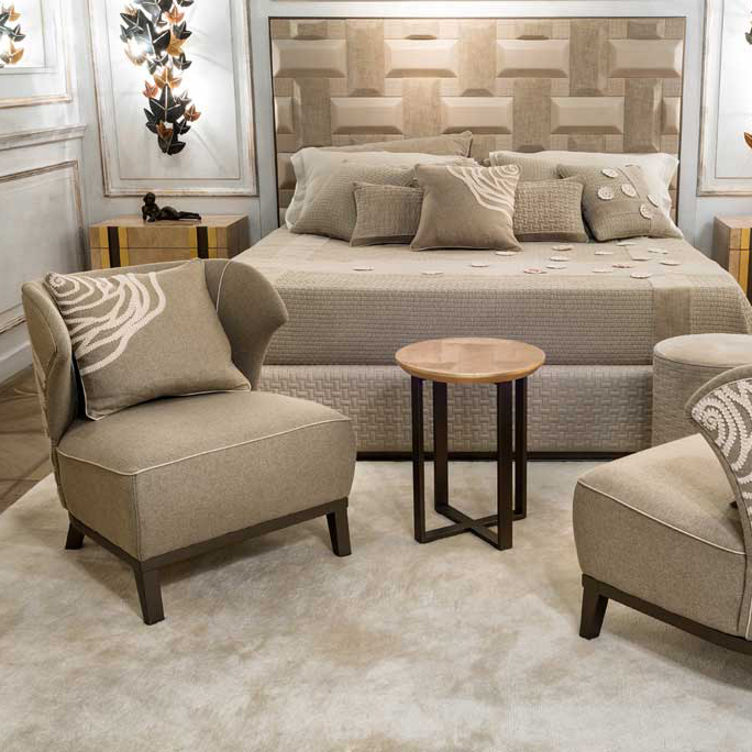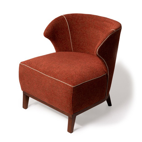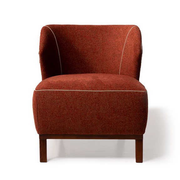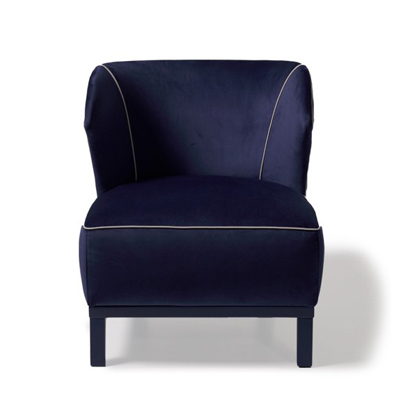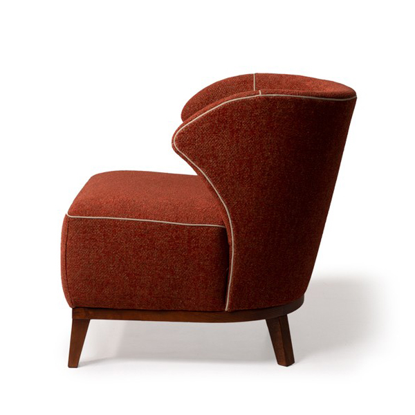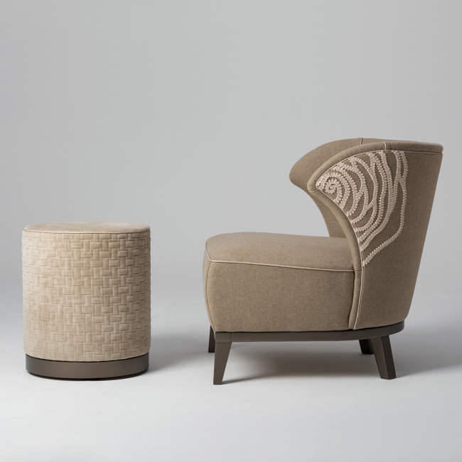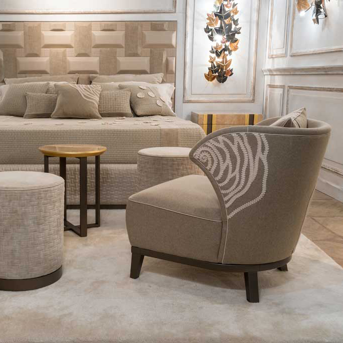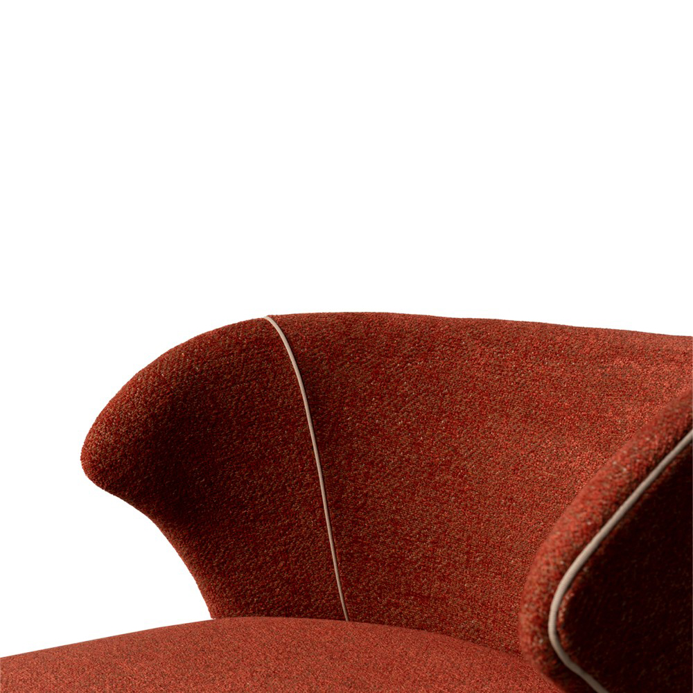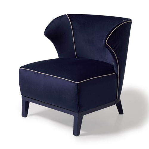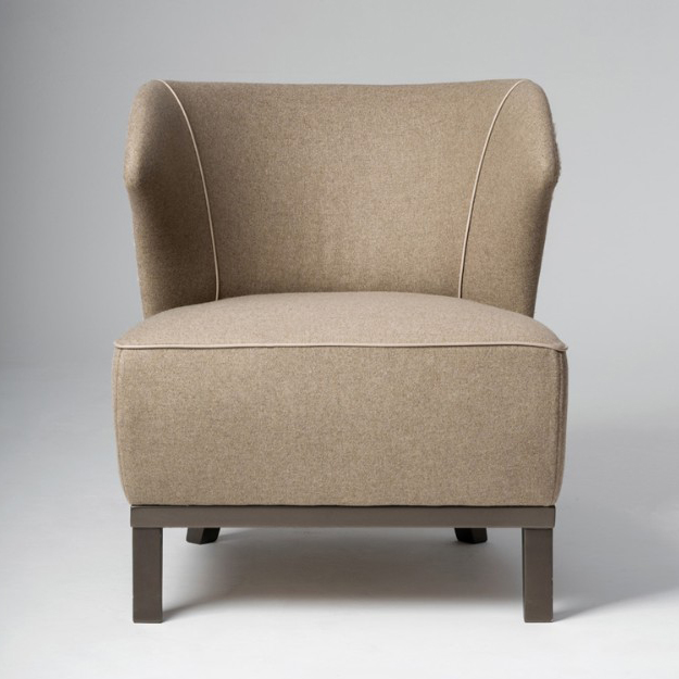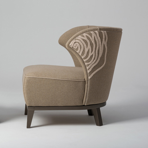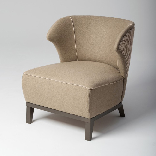 This small armchair, in wool fabric embroidered on the back and base in matt metal painted wood, is a true icon of contemporary design.