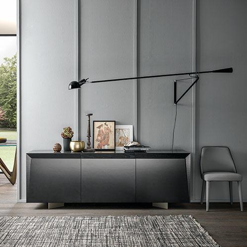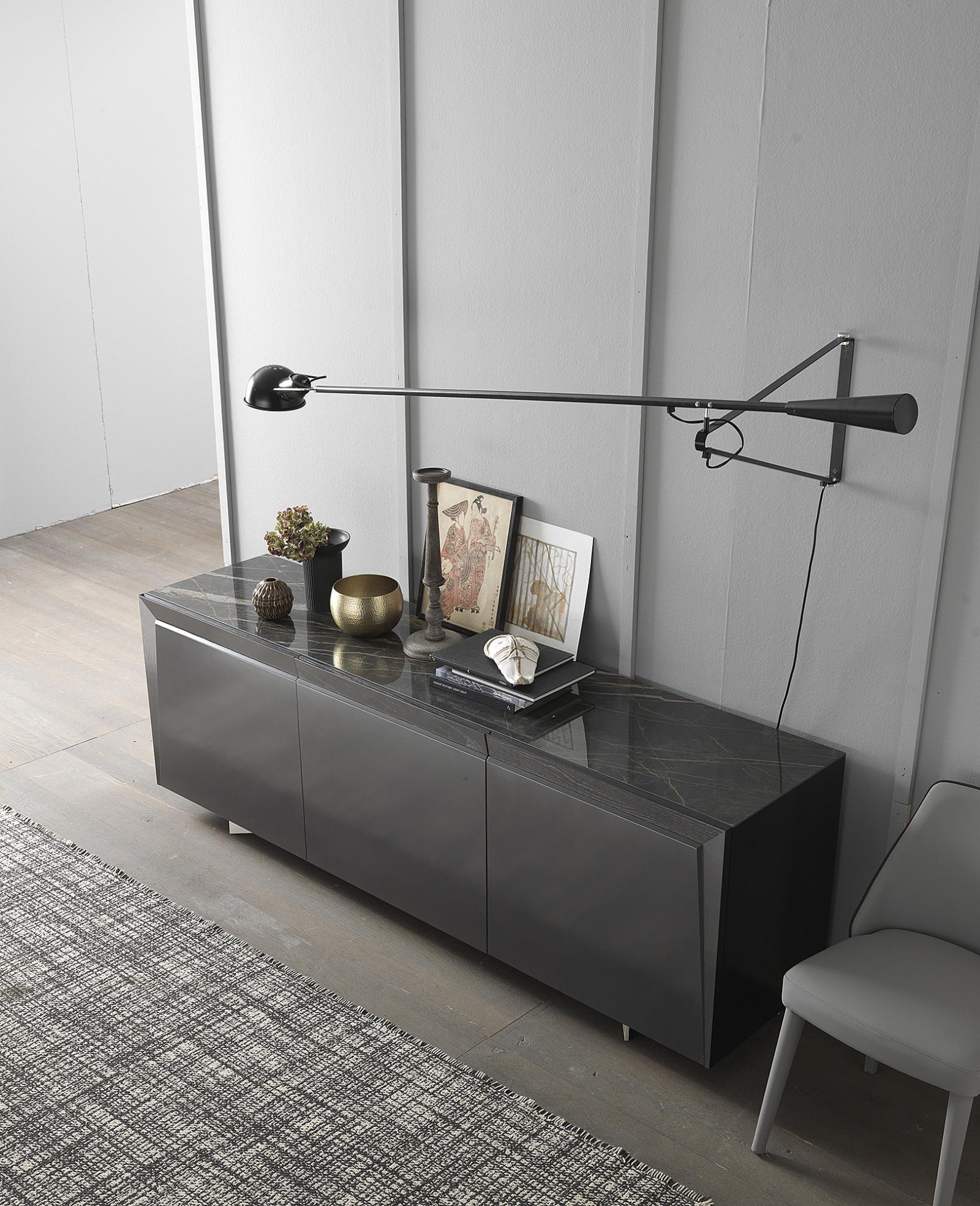 In the combination of several elements and materials, Dama expresses itself through the exclusive design of the door which plays with the inclinations creating pleasant three-dimensional effects, executed with mastery and formal rigor. The Dama sideboard consists of three lacquered doors, while the inclined profile that indicates the opening lives on extremely tactile solid wood. At the top, a precious ceramic completes the work worthy of her name.