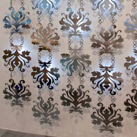 Metal, plasma cutted, curtain. Satined and painted gold, silver or black – or in Chromed metal. Available height extentions by 77 cm (30.3″). Customised curtains can be made with special lenghts by 33 cm (13″) incements.