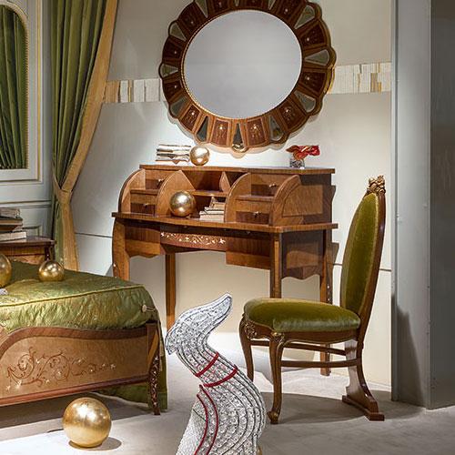 It has a structure in canaletto walnut, zebrano and érable, enriched with elaborate inlays. It is equipped with drawers, small drawers and pull-out shelves.