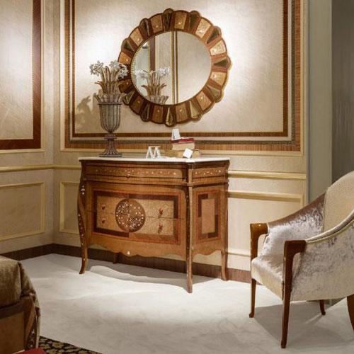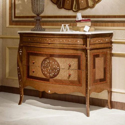 It has a structure in solid wood slabs veneered with essences of érable, canaletto walnut, bois de rose and zebrano. Central part embellished with inlay in various exotic essences. Elegant marqueterie illuminated by mother-of-pearl inserts.