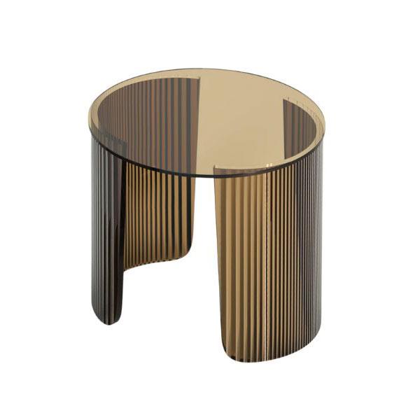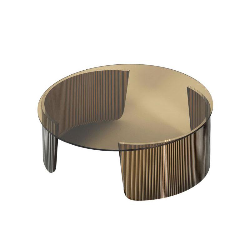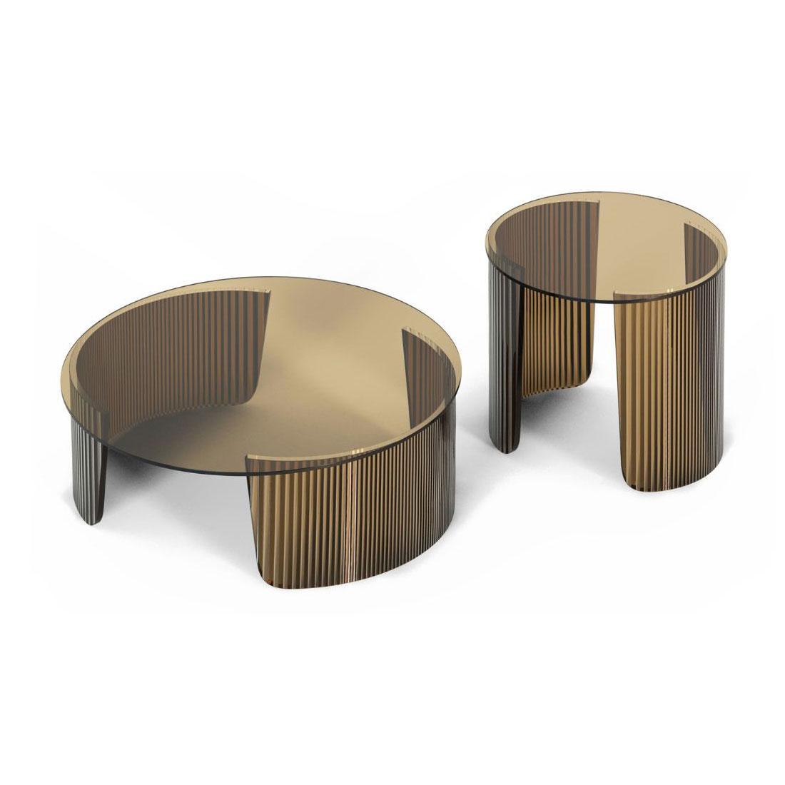 The COLOSSEO coffee tables combine sophisticated design and premium materials, featuring curved legs in annealed glass with a ribbed effect. Available in Ø50 cm and Ø80 cm, they showcase a pure and rigorous geometric form, softened by the warm transparency of bronzed glass.
