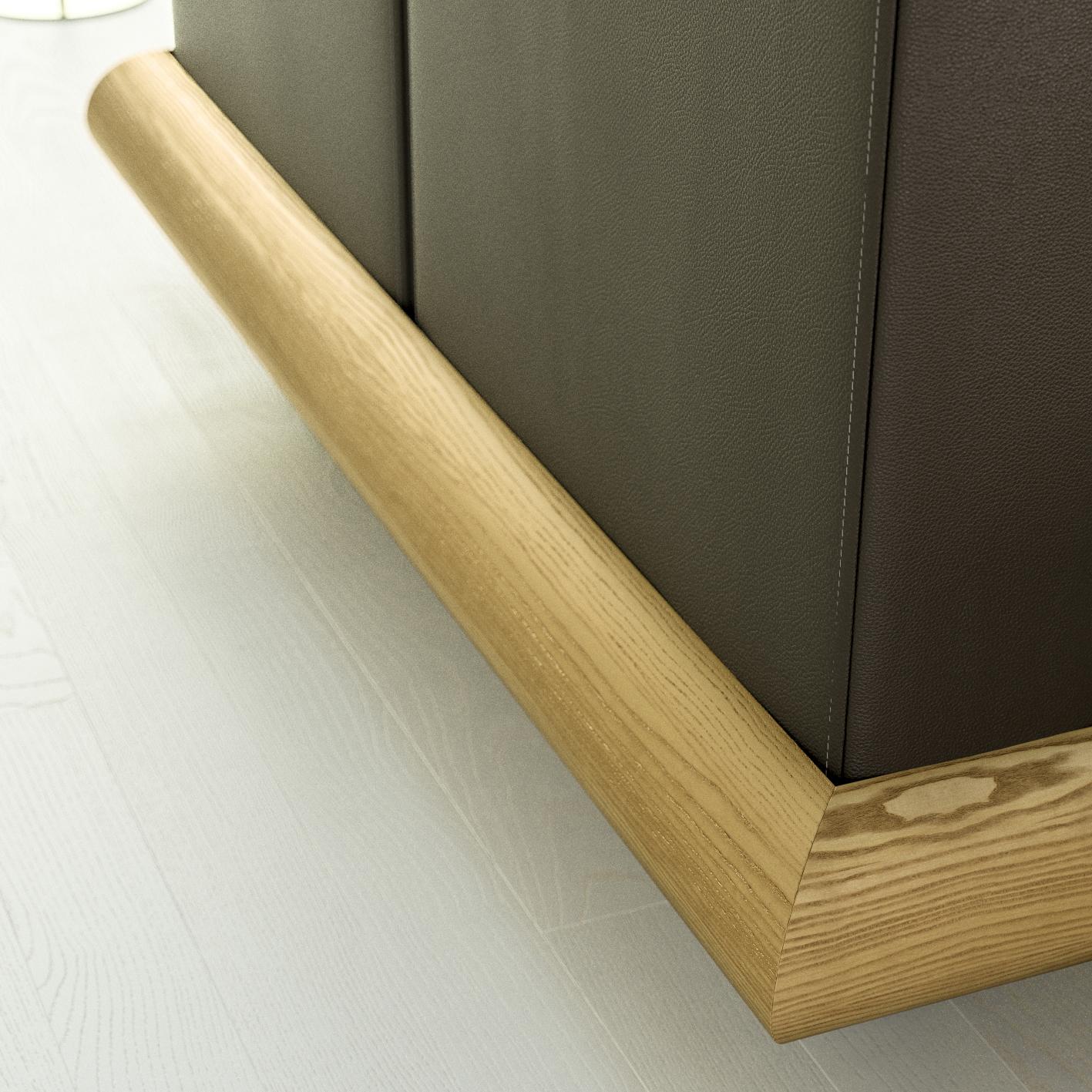 Ricordo is a bed that fits fully into the Fazzini design philosophy. The sumptuous rounded solid wood bed frame continues along the entire perimeter with 45 degree joints. This allows the bed to be positioned even in the center of the room, making it the true protagonist of the sleeping area. The two soft cushions that make up the solid wood headboard and feet can be made in all the finishes present in the collection.