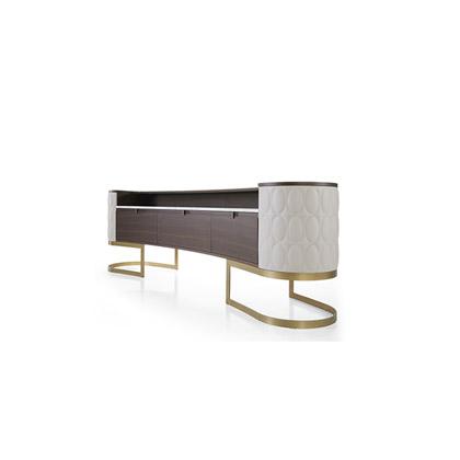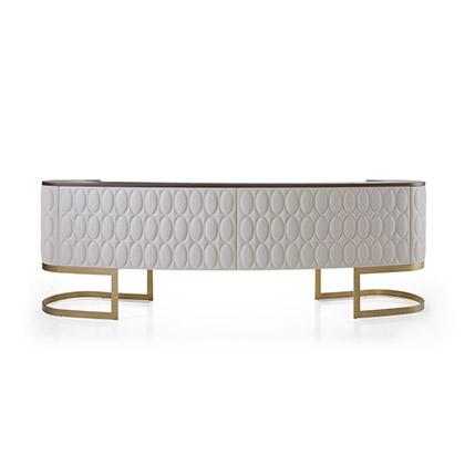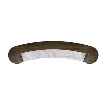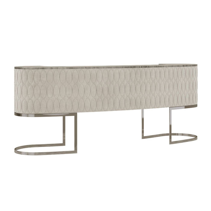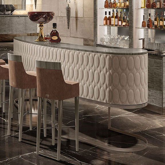 The Diamond bar counter is the main protagonist of a refined and trendy environment where every detail exudes luxury. The padded structure has a decorative pattern with oval shapes that reflect the configuration of the base. The wooden top follows the rounded shape of the entire structure.