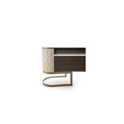 Padded bar counter with two deep drawers, open compartment, and metal trims and base.