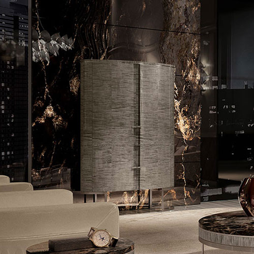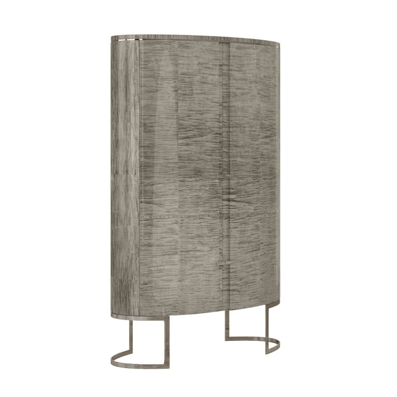 The exclusive oval shape of the Diamond bar unit makes the living area original and refined. The curved wood structure has four doors, internal mirrored sides and bottle holder. The feet of the metal cabinet give lightness to the entire element.
