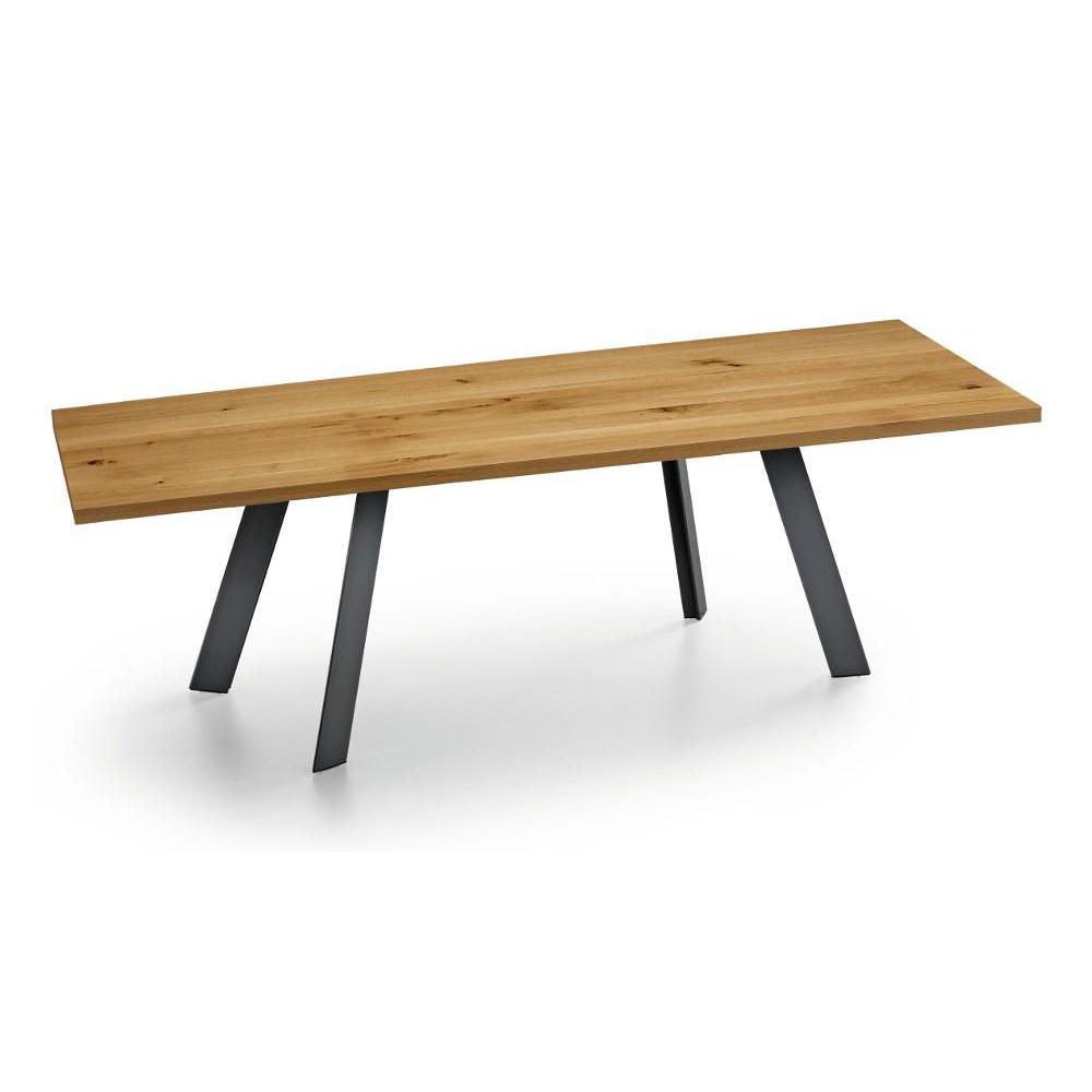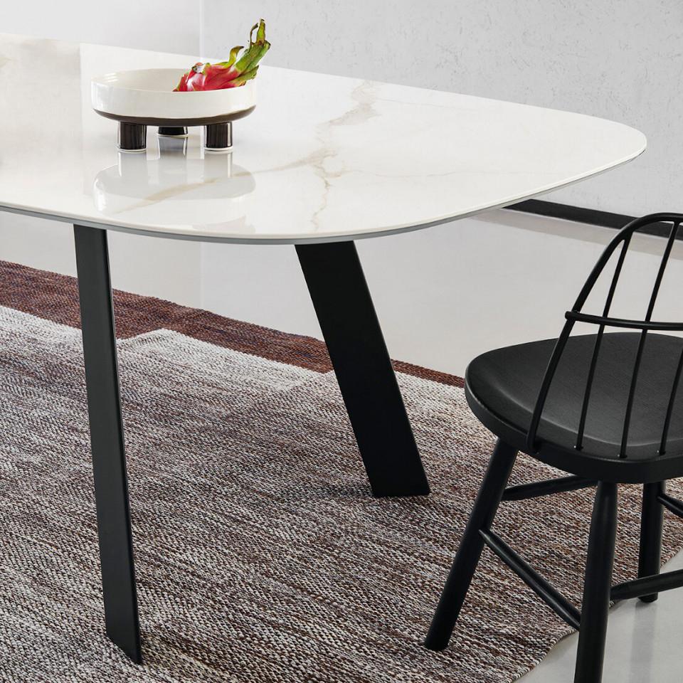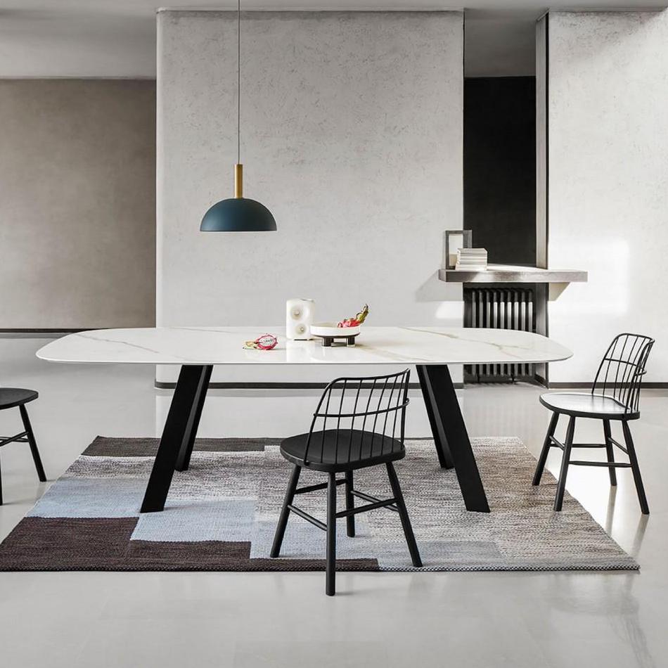 Table with four-legs base in lacquered steel available in different sizes. Top available in cristalceramica or solid wood.