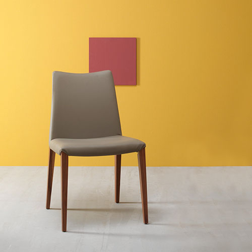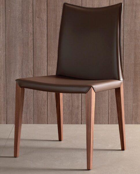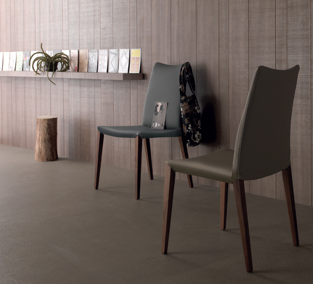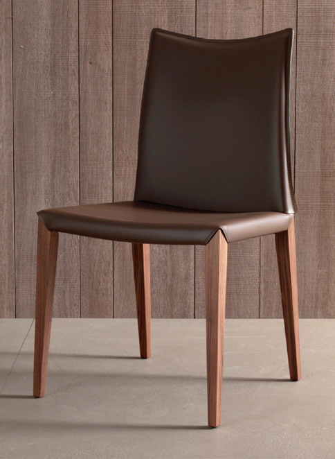 Chair with wooden legs in canaletto walnut, burned oak or grey oak. Seat covered with white, dove grey, dark brown, moka, anthracite grey, steel grey regenerated leather; white, dark brown, clay grey, ash grey or steel grey imitation leather; fuchsia, yellow ochre, purple, white, oyster white, pearl grey, mole grey or moka leather.