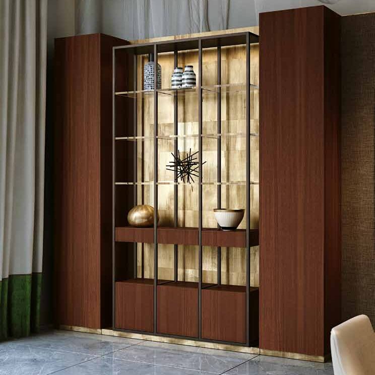 Canaletto walnut, internal shelves matt finished, push-pull door with internal crystal shelves.