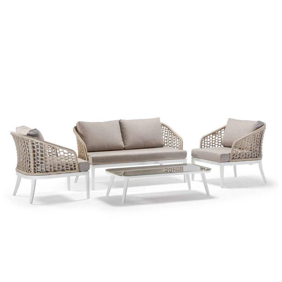 ALUMINIUM SET COVERED WITH POLYESTER AND RUBBER ROPE WITH ONE SOFA 2 SEATERS, TWO ARMCHAIRS AND ONE COFFEE TABLE WITH GLASS TOP. FAST DRY FOAM AND ACRYLIC FABRIC CUSHIONS.
