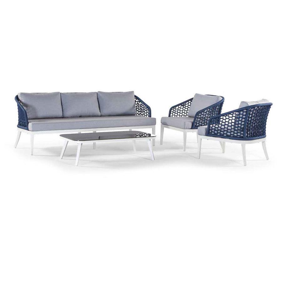 ALUMINIUM SET COVERED WITH POLYESTER AND RUBBER ROPE WITH ONE SOFA 3 SEATERS, TWO ARMCHAIRS AND ONE COFFEE TABLE WITH GLASS TOP. FAST DRY FOAM AND ACRYLIC FABRIC CUSHIONS.