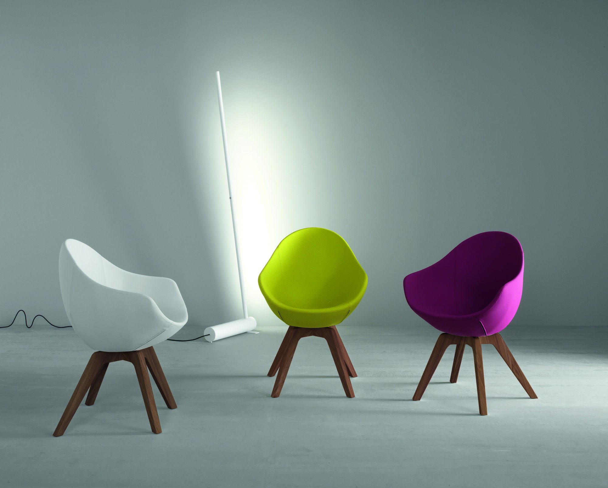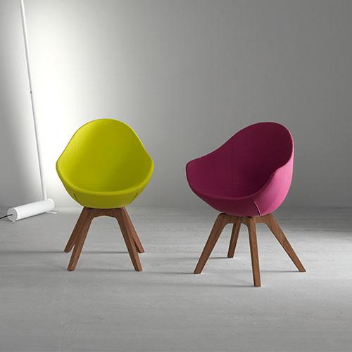 The particular shape of Jane armchair creates a perfect combination between comfort and design. The wrap-around seat gracefully matches both with its fixed wooden base and with its more dynamic swivel metal base.