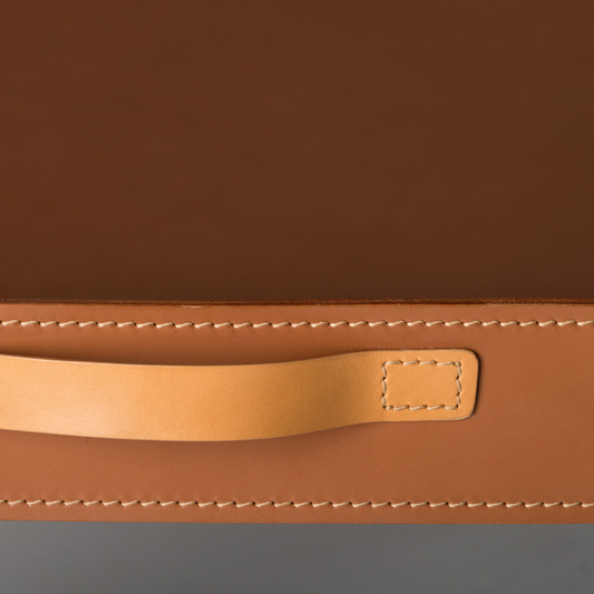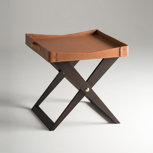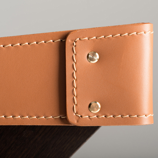 The top surface is made of real leather and the base of walnut painted beech is enriched by precious details in burnished brass.