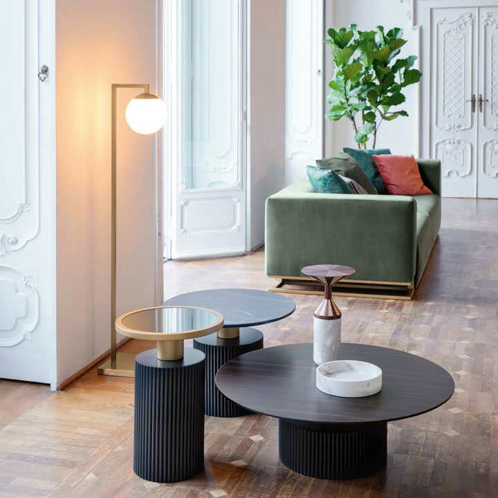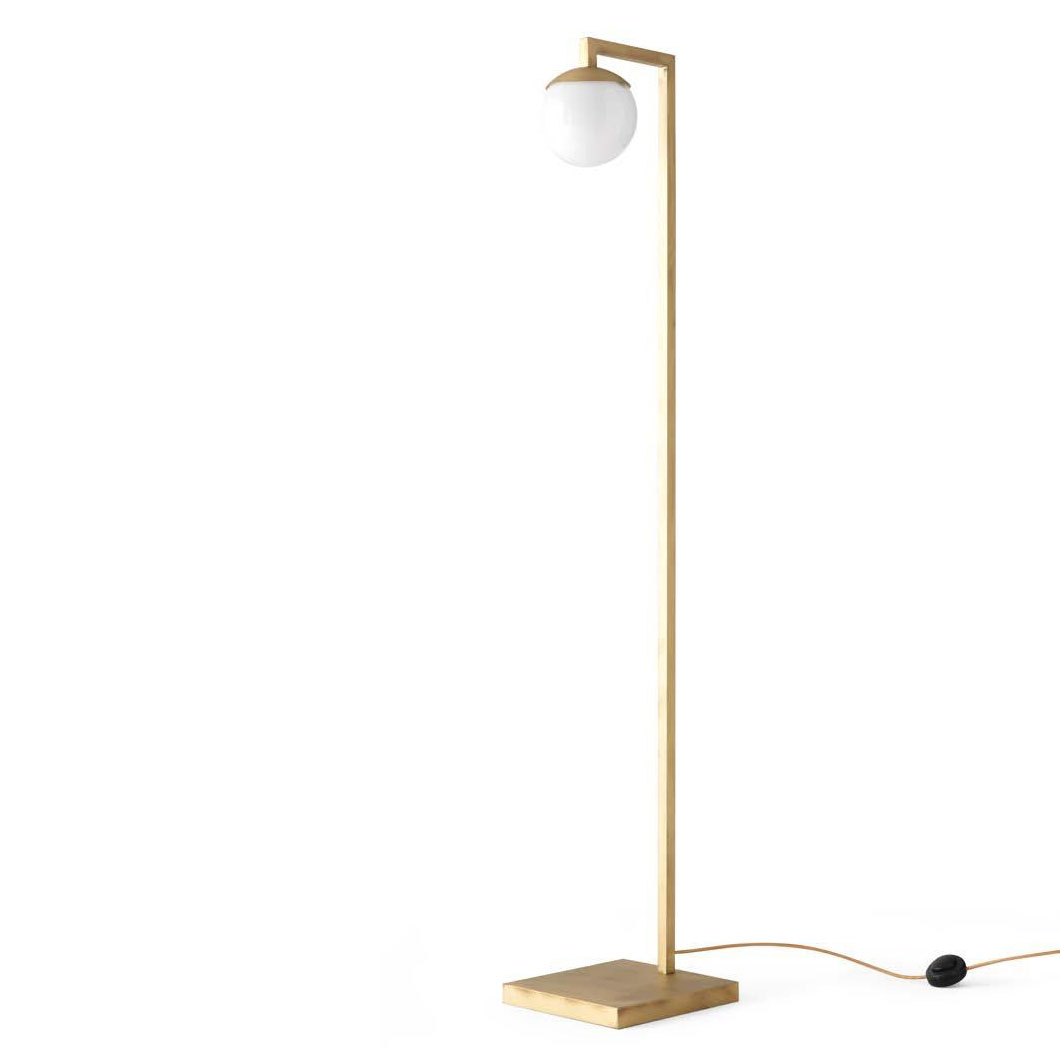 Floor lamp with square base, metal brass finish and white glass sphere