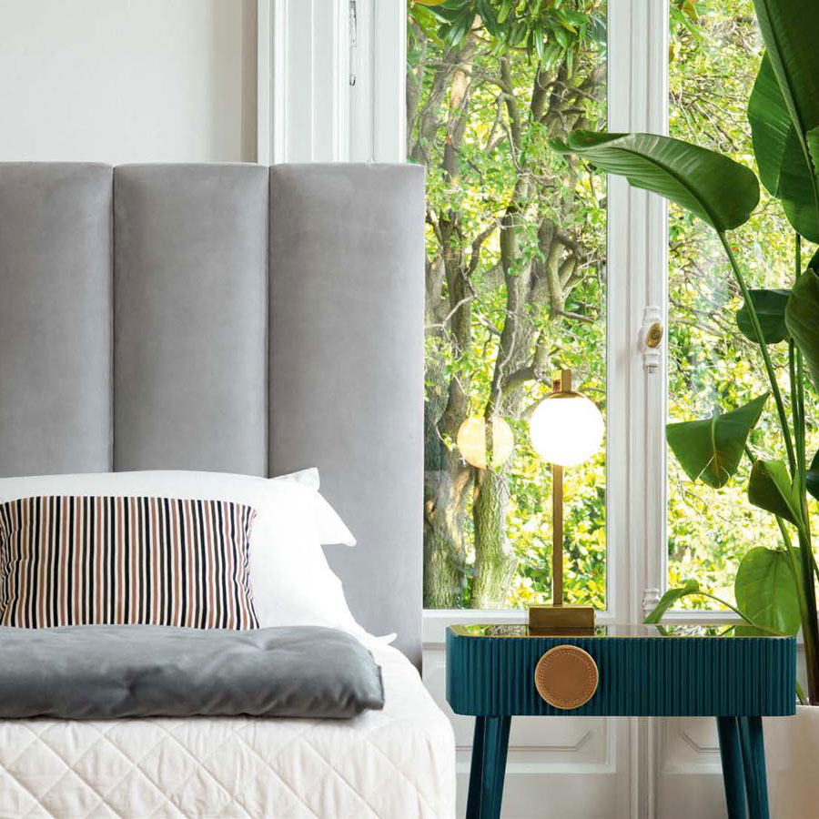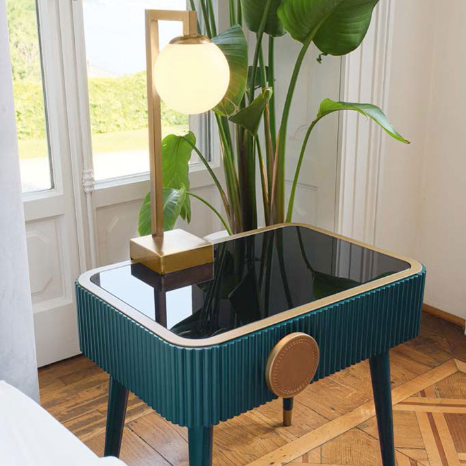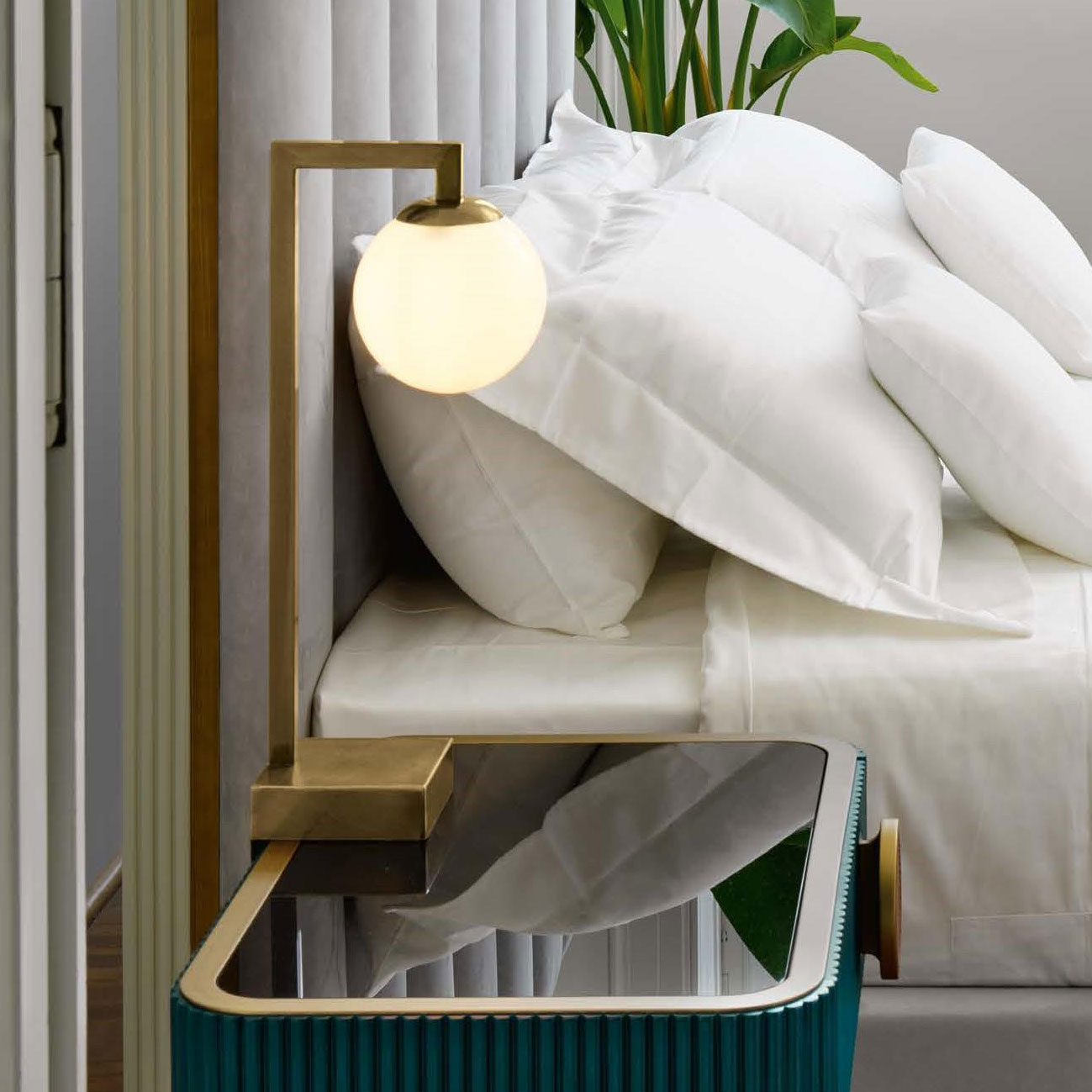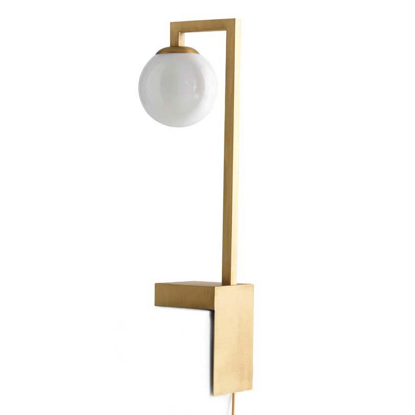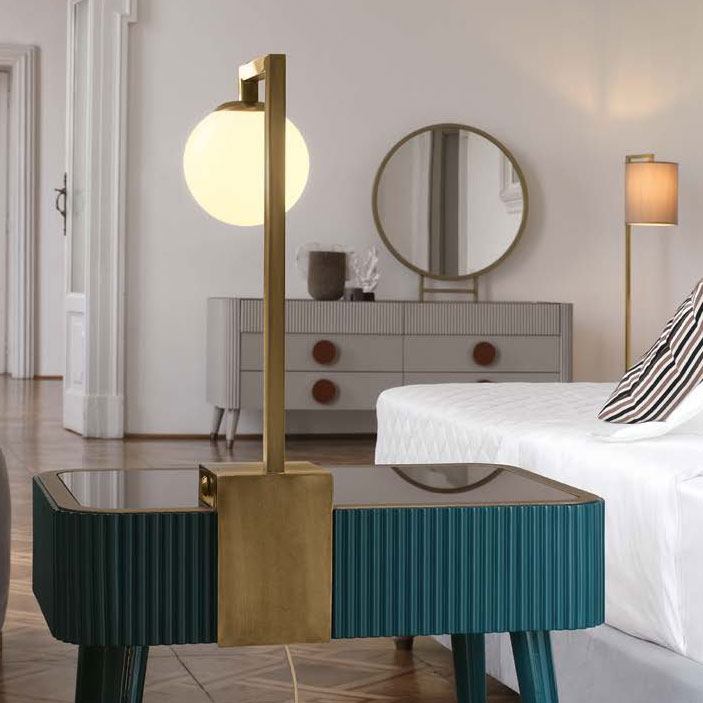 Built-in table lamp, metal brass finish and white glass sphere. Touch button on/off feature.