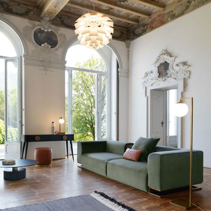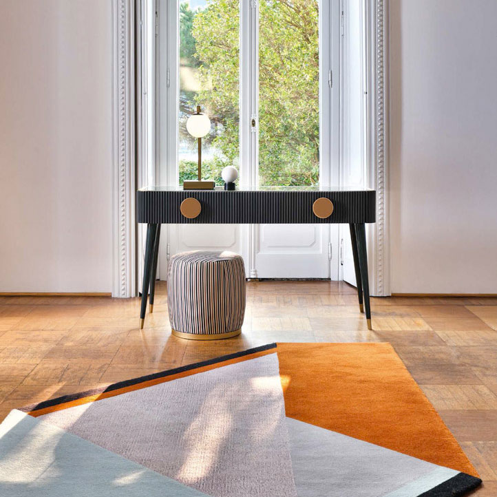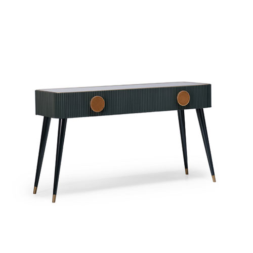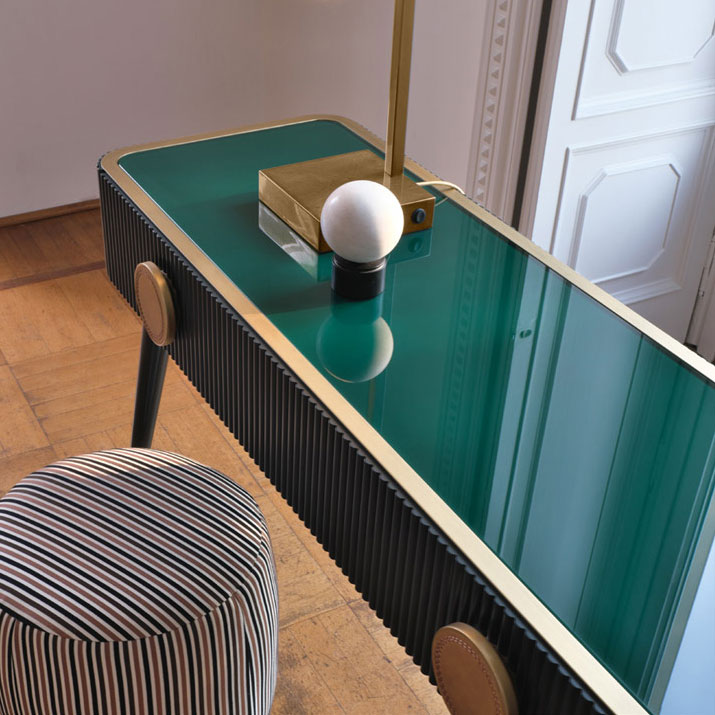 A console table that seeks lightness in every detail: from the slender, sloping legs to the canneté pattern surrounding the frame. The table top is made of lacquered glass; brass and leather finishes create a pleasing visual contrast.