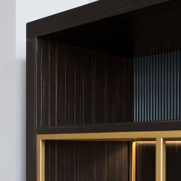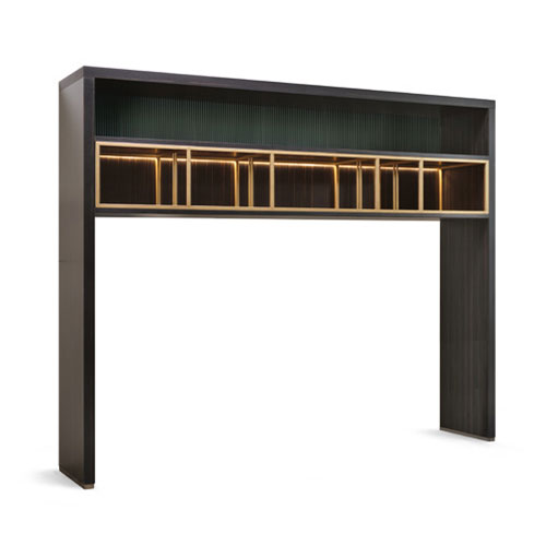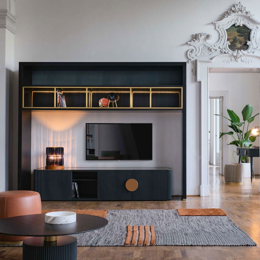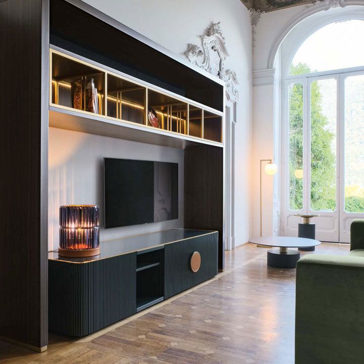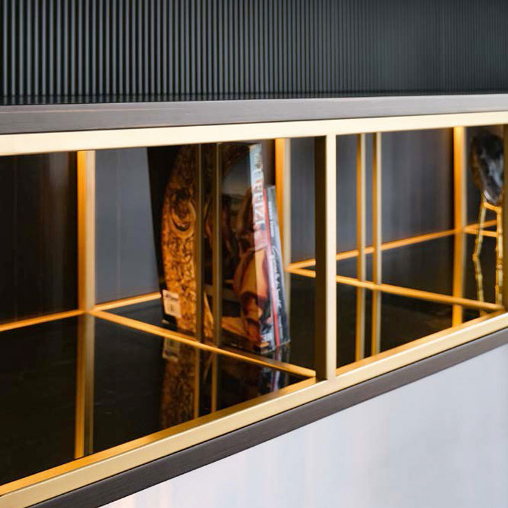 Equipped wall unit in ebony essence with brass lacquered metal dividers, smoke glass tops with LED light. The wall unit is the perfect frame for the Wide TV cabinet.