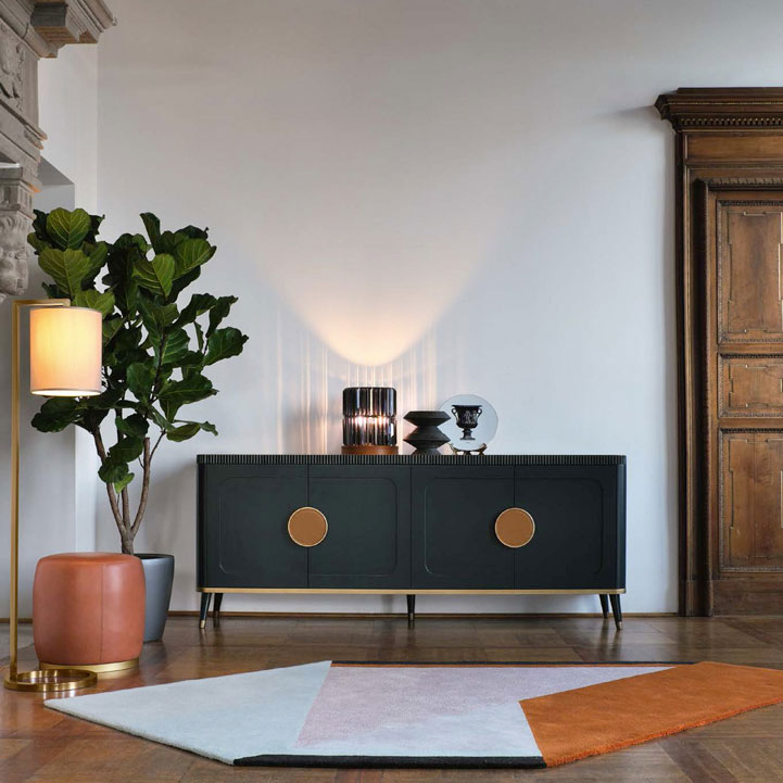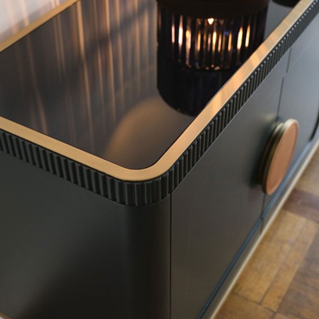 Important but refined and elegant, the sideboard matches two faces: an exterior solidity that hides a sophisticated inner balance of light, color and reflections.