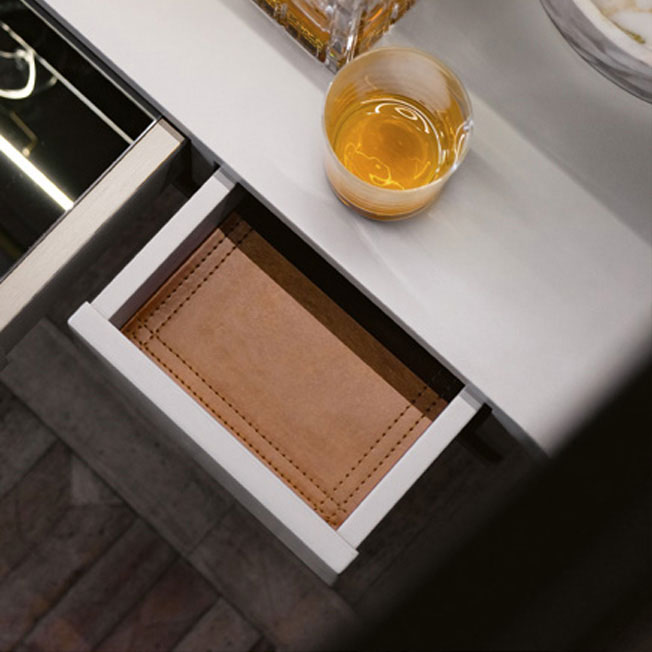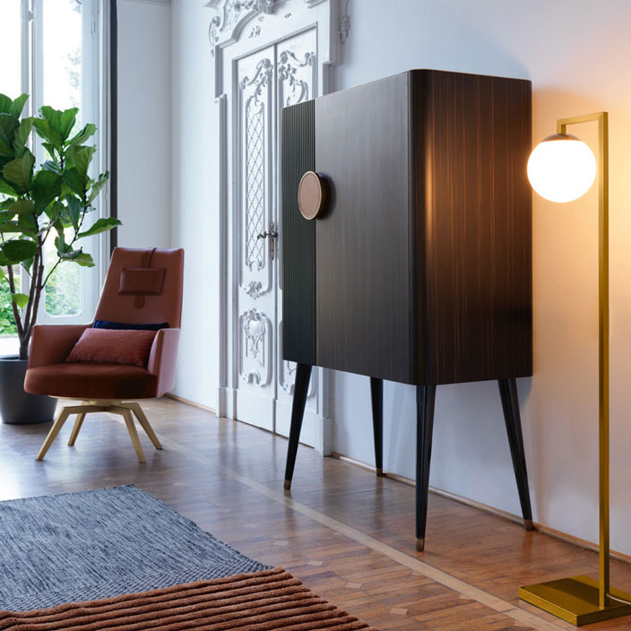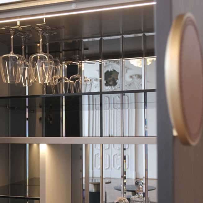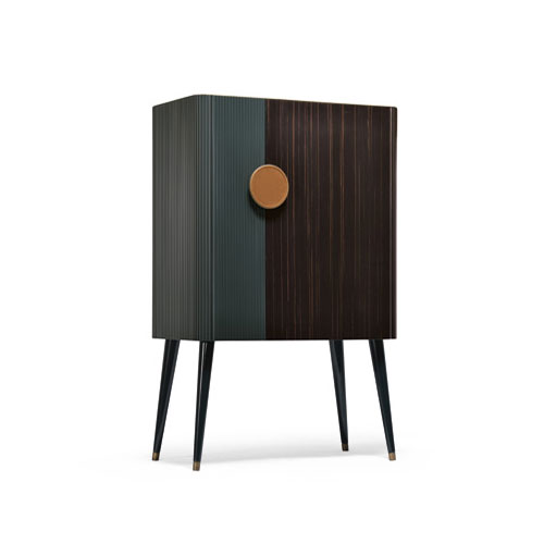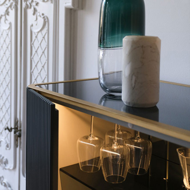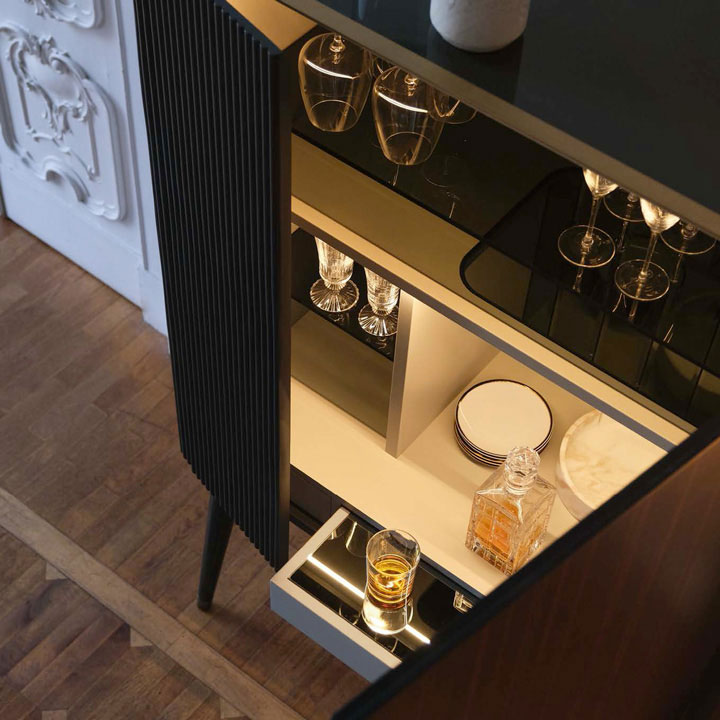 The bar combines the canneté wooden pattern with the ebony essence. Lacquered glass top with brass varnished profile. Inside useful accessories and precios details illuminated with opening sensor LED light.