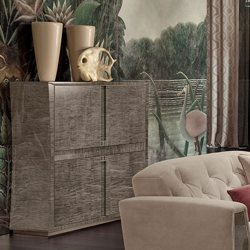 The Pearl bar unit contains everything needed to welcome guests in the best possible way and to give a cosmopolitan touch to the living area. The structure consists of four doors with steel cup holders and compartments with shelves. The practical internal lights guarantee optimal functionality and create a beautiful scenographic effect.