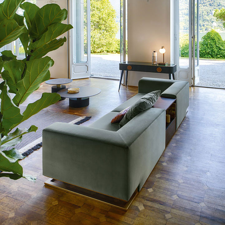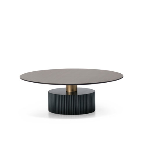 A large coffee table with ebony veneer top, rigorous and elegant, built on a few carefully chosen elements suach as the canneté base and cylindrical stand in brass finish. Prefect balance.