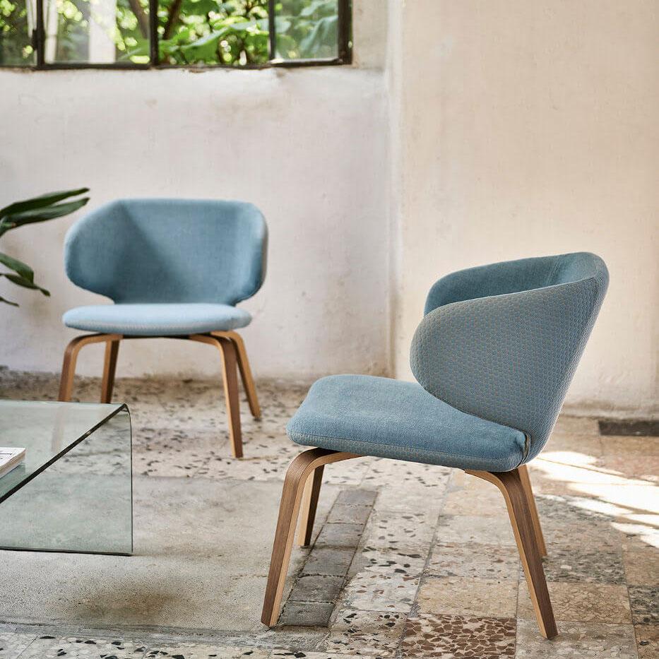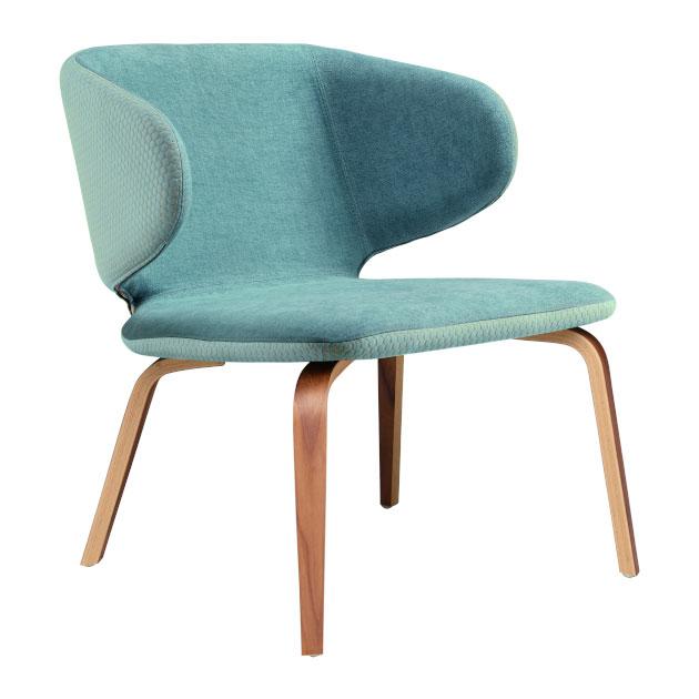 Armchair with four legs base in wood. Shell upholstered in fabric, leather or faux leather with possibility to upholster front and back face in contrasting materials or shades.