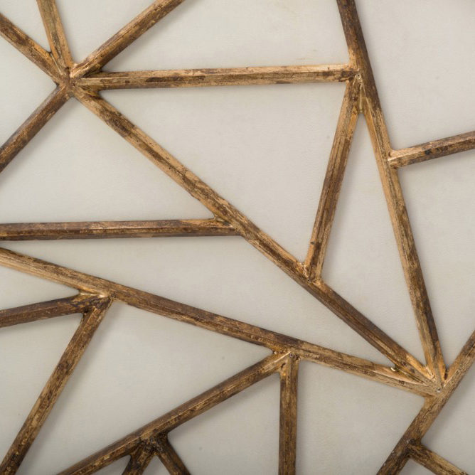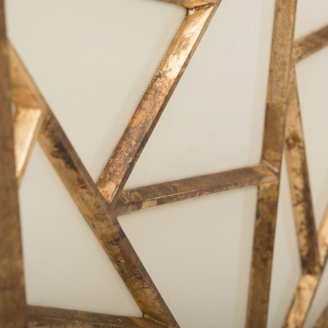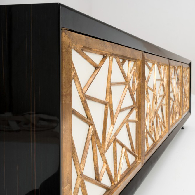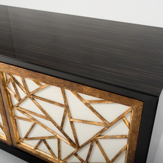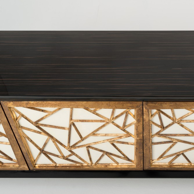 The structure is in glossy lacquered macassar ebony with shaded orange streaks and the doors are covered in antique parchment with woodwork with triangular geometric cut in a splendid gold leaf finish.