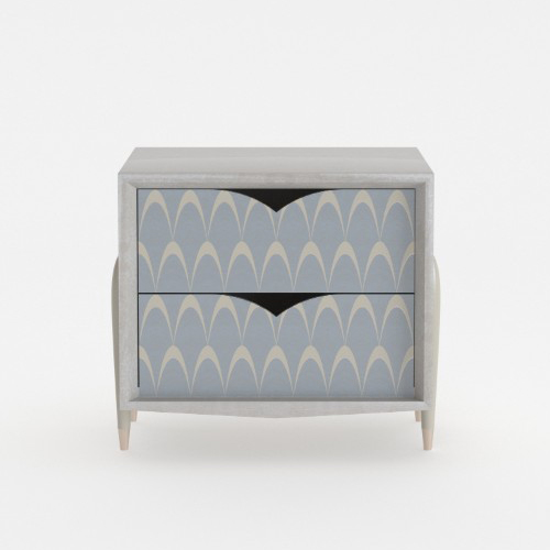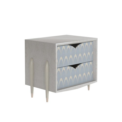 In fact, it is on the surfaces of drawers, doors or table tops that the decorative essence of the various elements reaches its peak, it is here that you can appreciate an elaborate inlay of various materials skilfully combined to reproduce the style to which this collection makes reference: the peacock wheel.