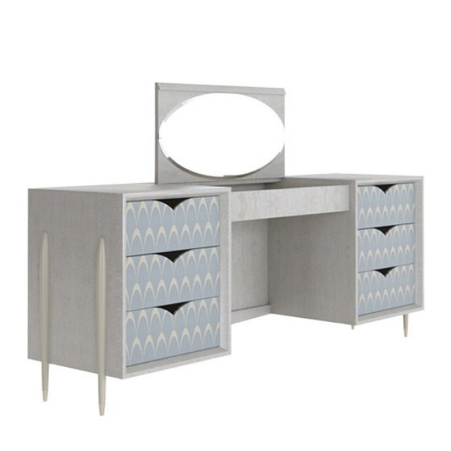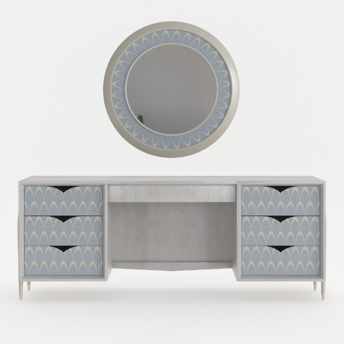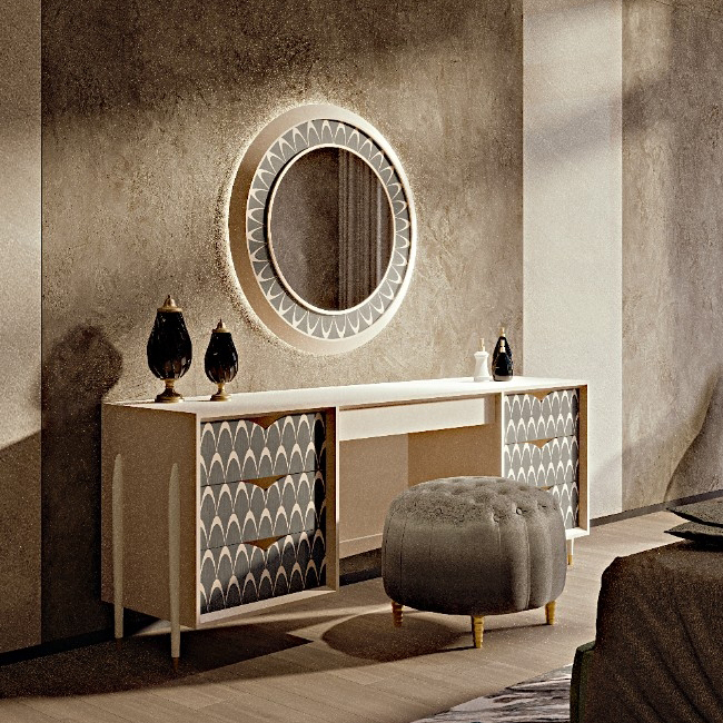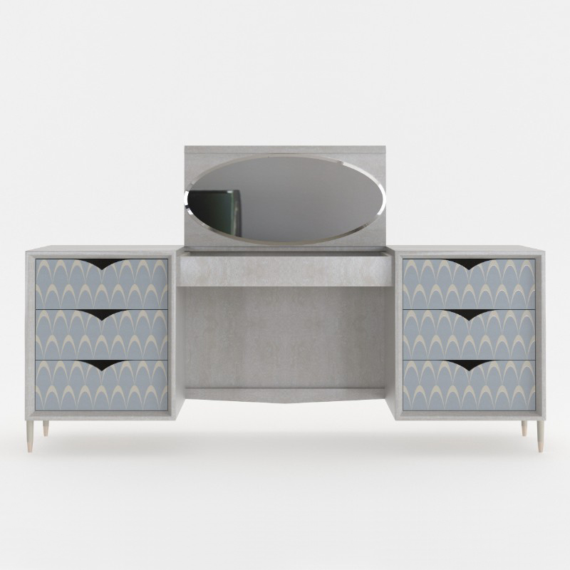 In fact, it is on the surfaces of drawers, doors or table tops that the decorative essence of the various elements reaches its peak, it is here that you can appreciate an elaborate inlay of various materials skilfully combined to reproduce the style to which this collection makes reference: the peacock wheel.