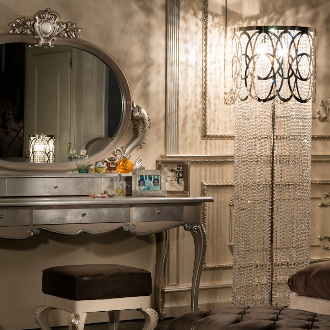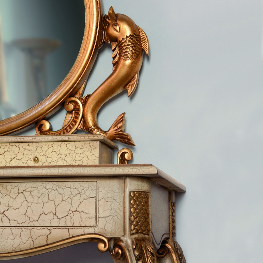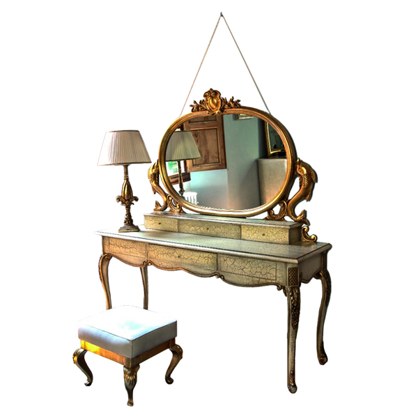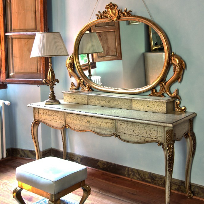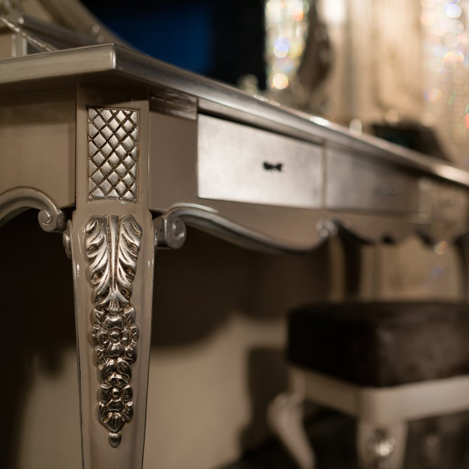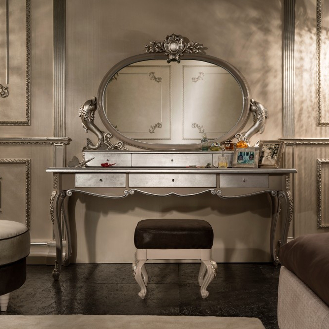 Maria Antonietta, the dressing table with mirror and pouf with artistic lines designed by Alberto Papi, finds in the lightness of the carving the decorative element that enhances the composition.