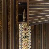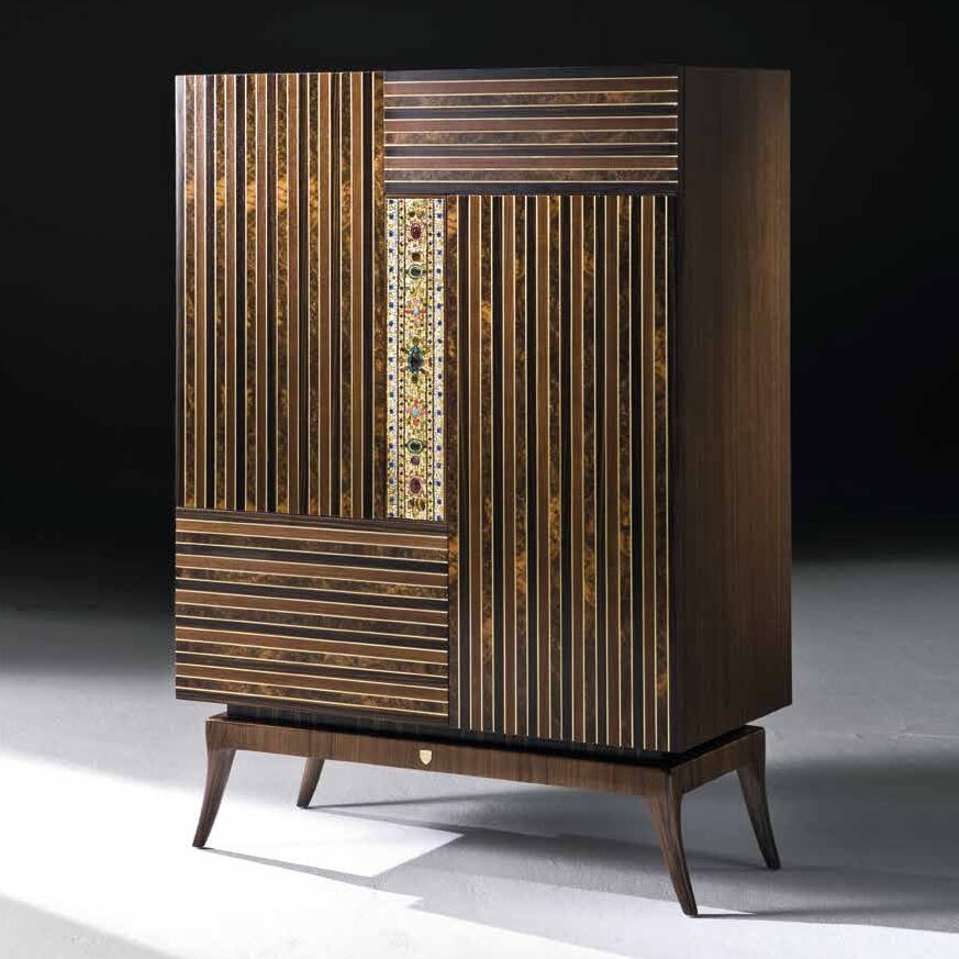 Walnut Cabinet, inlayed doors with brass details, central gold mosaic and precious stones, Inside part with drawing and shelves.