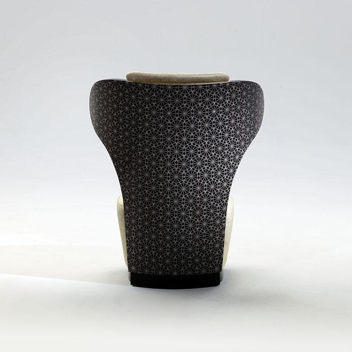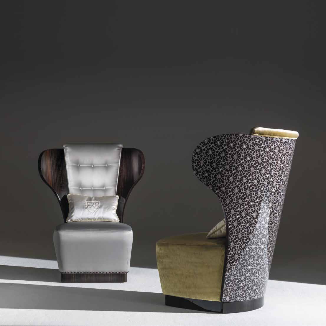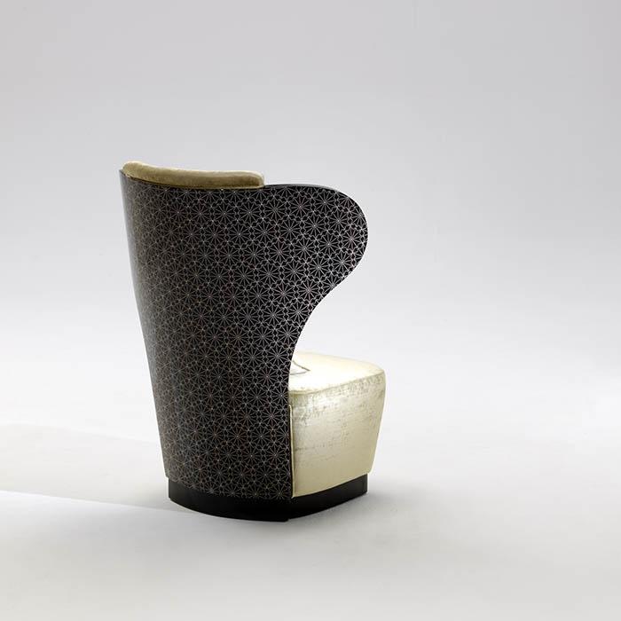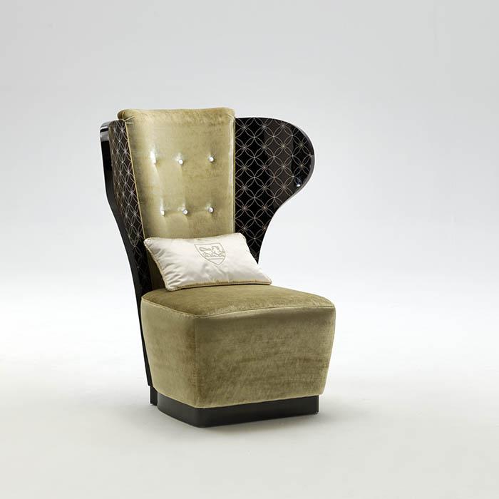 Stuffed armchair, ebony and ivory inlayed, back cushion with logo.