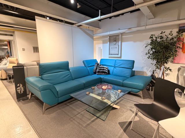 Aqua turquoise leather & with 1 power recliner (adjustable headrests)