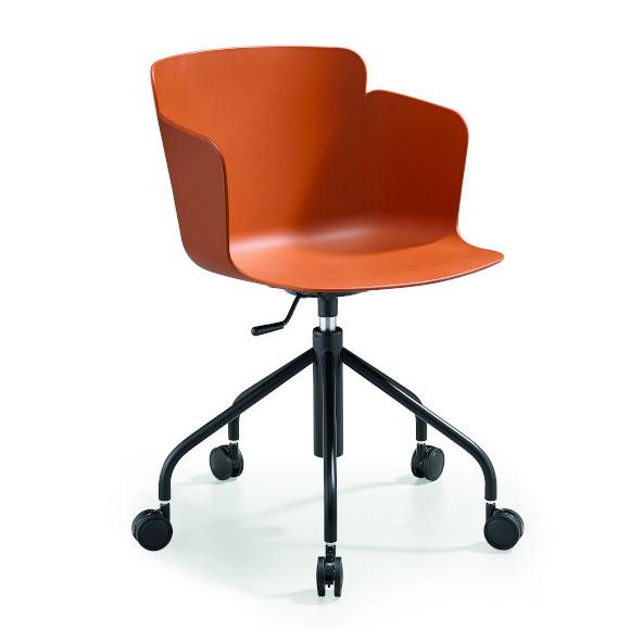 Calla swivel and height-adjustable task armchair. Five-ways base in painted steel on wheels and polypropylene seat. Optional: fixed cushion for the seat. The armchair is also available in the version without armrests, in plastic or upholstered.