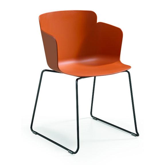 Calla armchair with steel sled base. Polypropylene seat. The version with lacquered base in matt finish and polypropylene seat is suitable for outdoor use. Optional: cushion upholstered in leather, faux leather or fabric, for indoor use only.