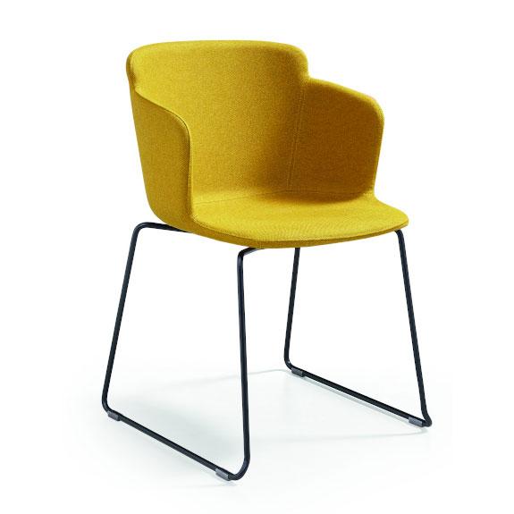 Calla armchair covered with armrests. Sled base in steel and seat upholstered in leather, faux leather or fabric. Calla armchair is also available in the version without armrests, both in plastic and padded.