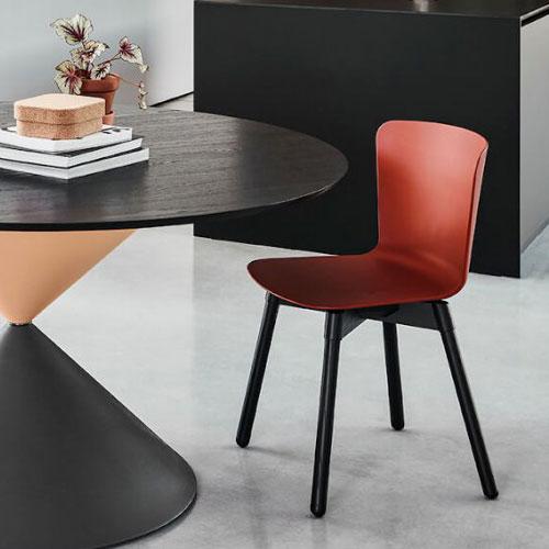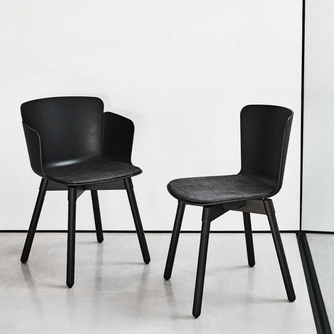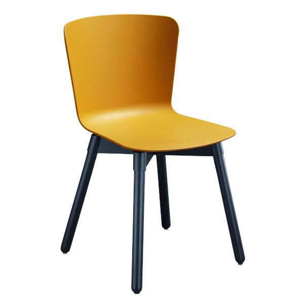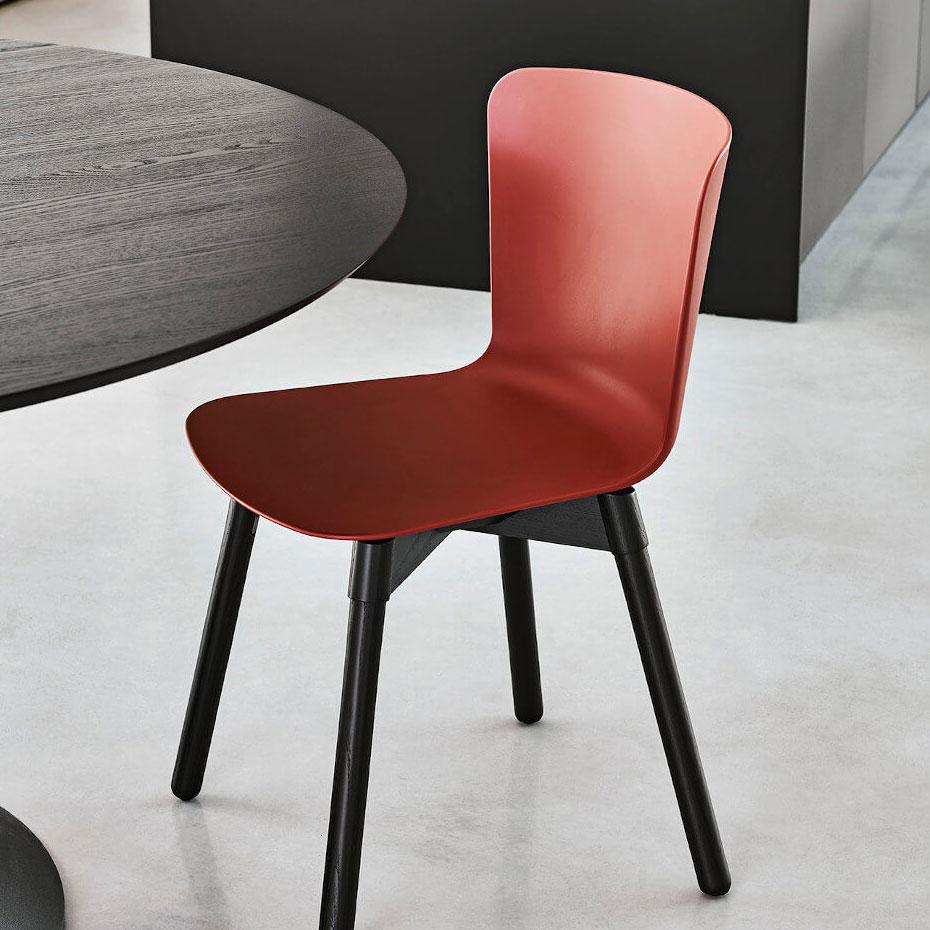 Chair with four legs base in wood. Polypropylene seat. Optional: cushion in fabric. leather or faux leather.