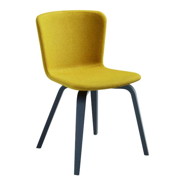 Chair with four-leg base in wood. Seat upholstered in fabric, leather or faux leather.